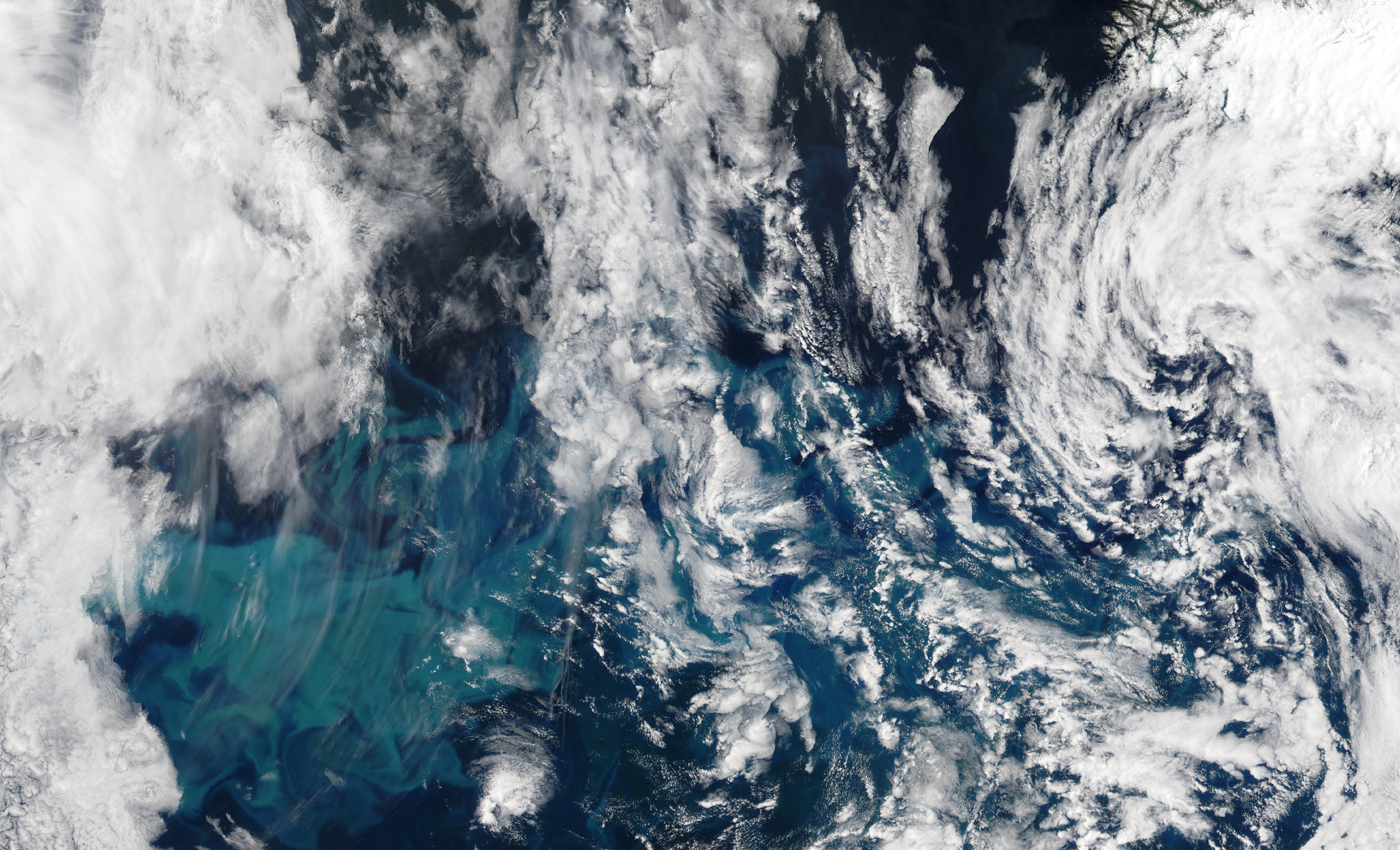 Swirling clouds of phytoplankton bloom in the northern Atlantic Ocean southeast of Greenland. Phytoplankton thrive in cold, nutrient-rich water, and when they multiply in significant numbers, the “clouds” they form can be seen from space, as shown here. This true-color Aqua MODIS image was acquired on July 6, 2003.