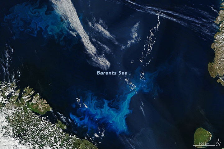 Phytoplankton have exploded in numbers this year across the Barents Sea, as seen in this image that was captured on July 26 by the Moderate Resolution Imaging Spectroradiometer (MODIS) on NASA’s Terra and Aqua satellites.