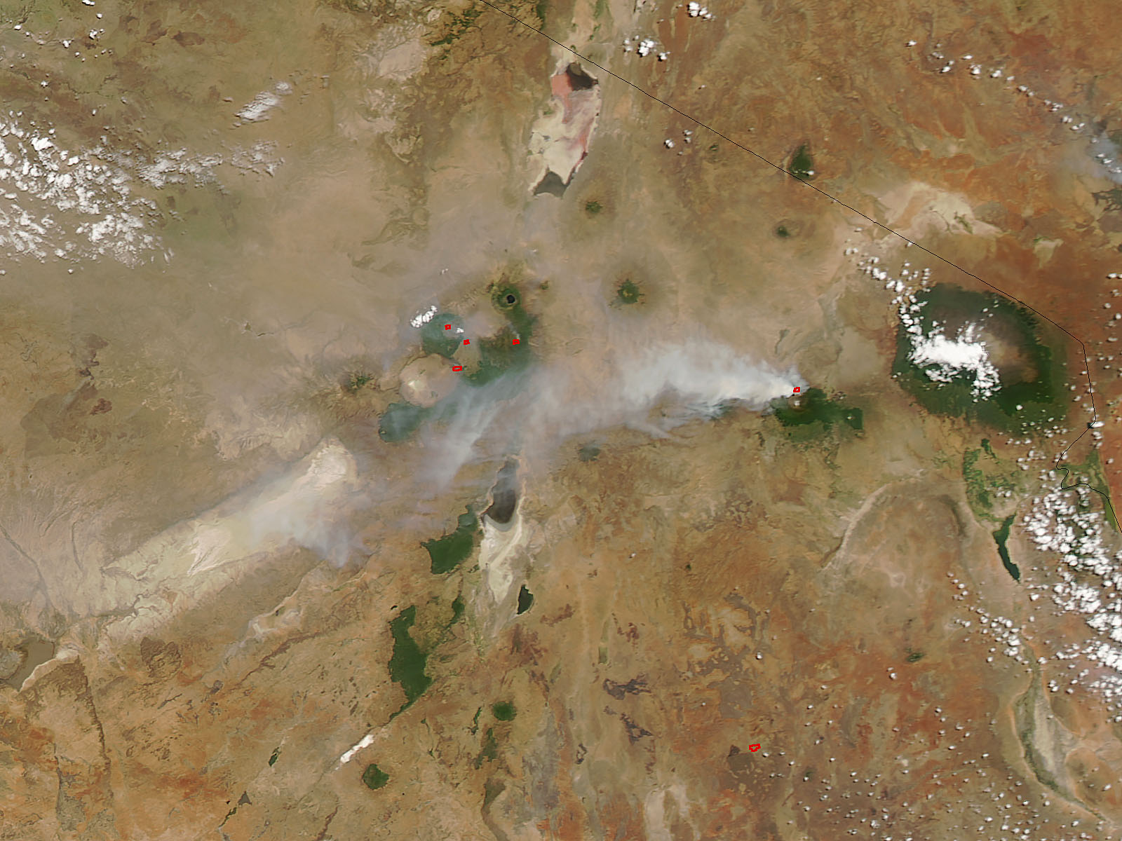 The Moderate Resolution Imaging Spectroradiometer (MODIS) on NASA’s Aqua satellite acquired this natural-color image of the plume on September 20, 2015. Red outlines indicate hot spots where the sensor detected unusually warm surface temperatures.
