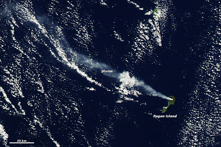 Plume from Mount Pagan the larger of two volcanoes on Pagan Island, has been active for more than three years. On October 16, 2012, a plume of steam and other volcanic gases streamed from the volcano. This natural-color satellite image of the eruption was captured by the Moderate Resolution Imaging Spectroradiometer (MODIS) aboard the Aqua satellite.