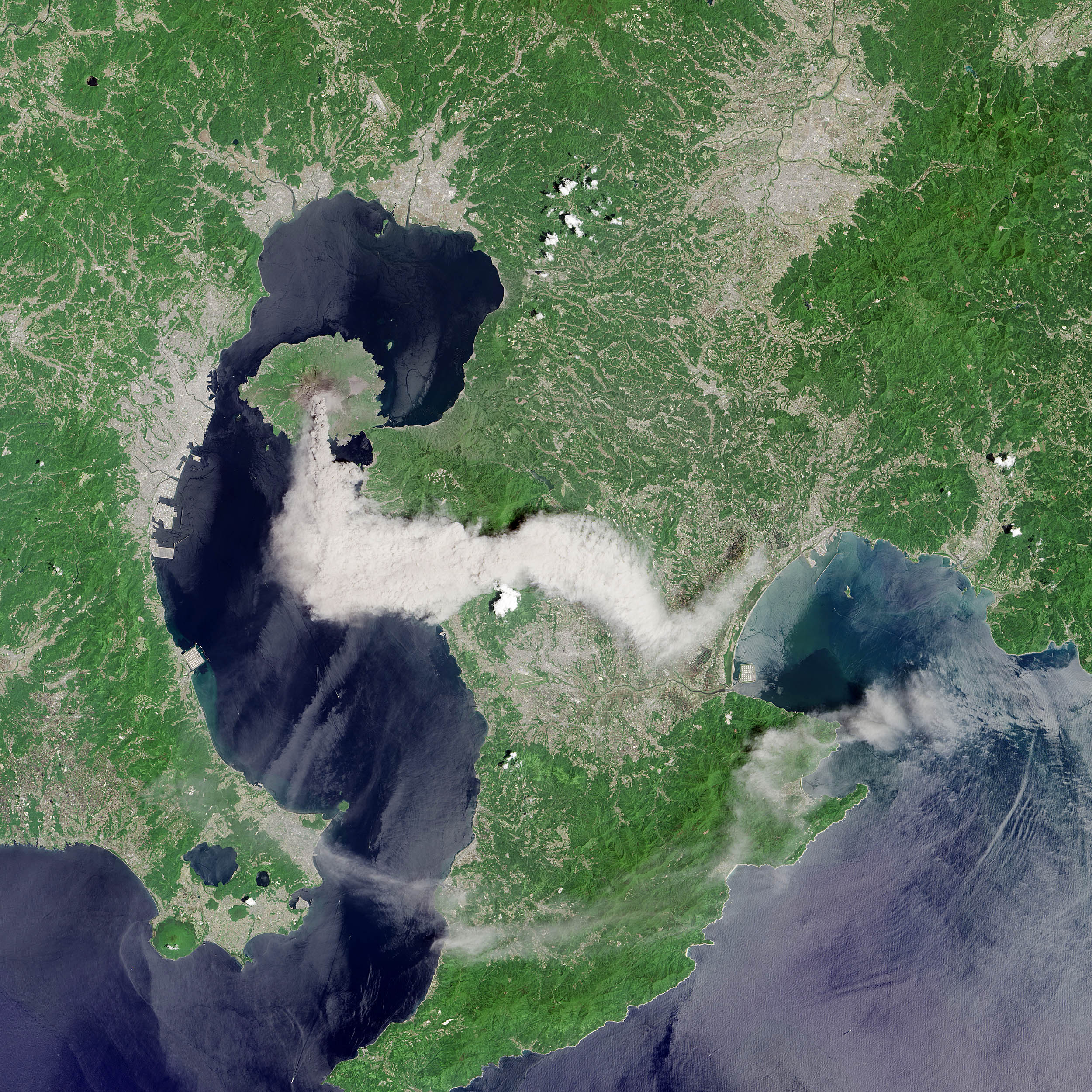 Plume From Sakura-Jima Volcano. Sakura-jima volcano spewed a dense plume of ash over the Japanese island of Kyushu on May 21, 2015. Currently Japan’s most active volcano, Sakura-jima explodes several hundred times each year. These eruptions are usually small, but the larger eruptions can generate ash plumes that soar thousands of meters above the 1,040-meter (3,410-foot) summit.
