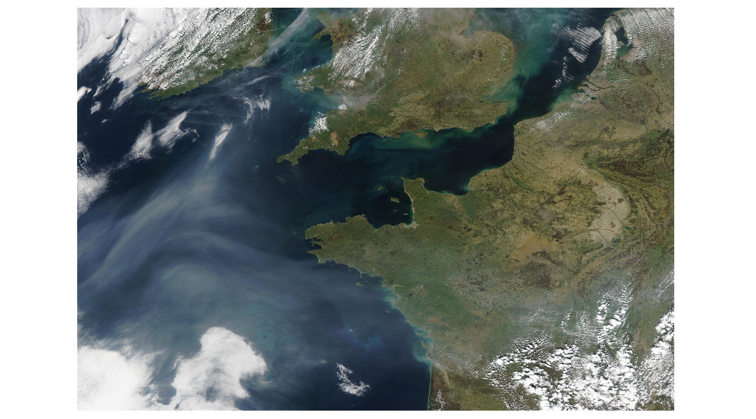 This Moderate Resolution Imaging Spectroradiometer (MODIS) image from the Aqua satellite on March 31, 2003, shows pollution swirling above the Atlantic Ocean off the west coast of France (bottom right). At top center is the southern part of the United Kingdom, with Ireland to the west.