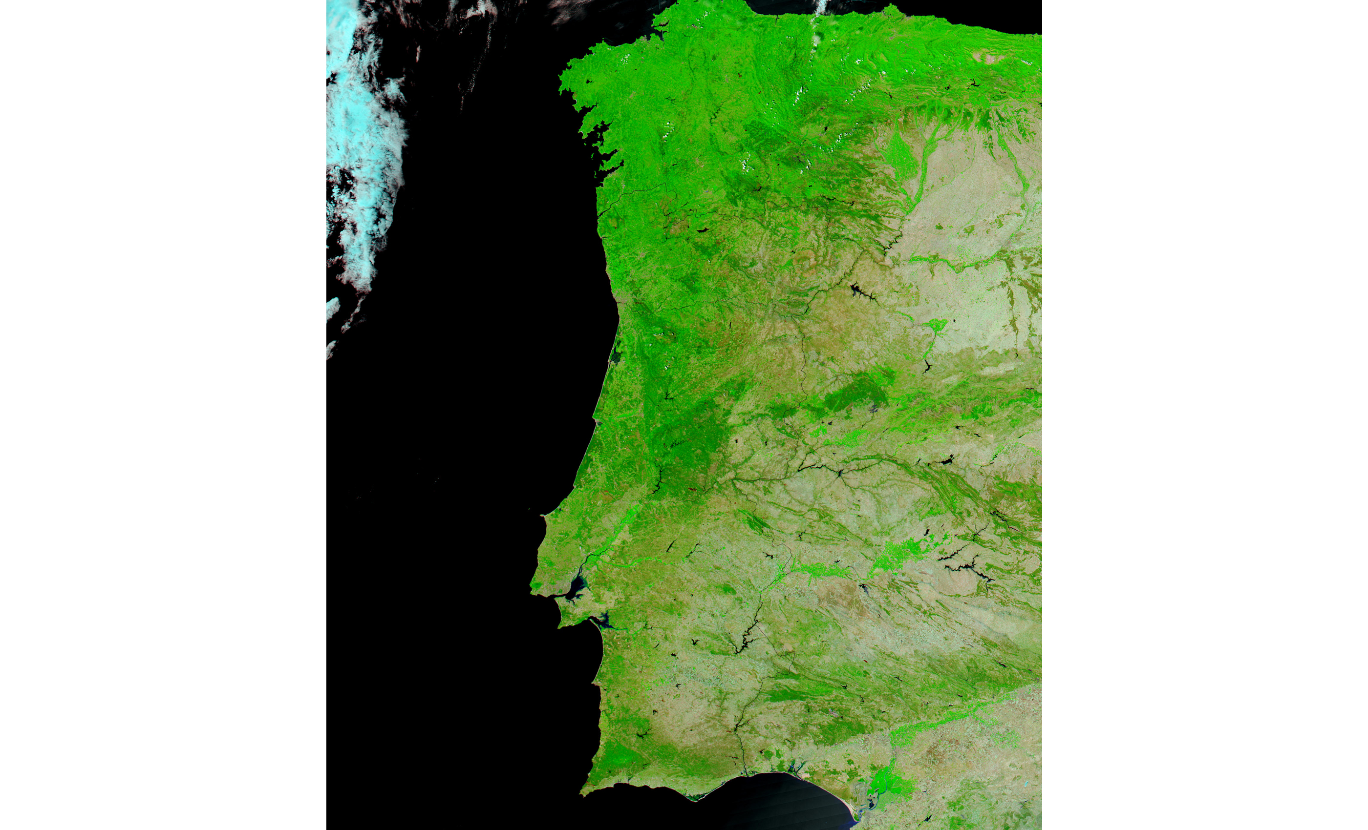 Portugal (False Color, Before Fires). Hot and dry conditions over the Iberian Peninsula produced dozens of forest fires in Portugal (left of center) and southern Spain (right) in August 2003. Hundreds of firefighters worked for several weeks to control large forest fires in central and southern Portugal. Media reports indicate that about 70,000 residents in nearby communities were without power or phone during the fires, and 15 people lsot their lives. These images of the fires (marked in red), were captured by the Moderate Resolution Imaging Spectroradiometer (MODIS) on the Terra and Aqua satellites in July and August 2003.