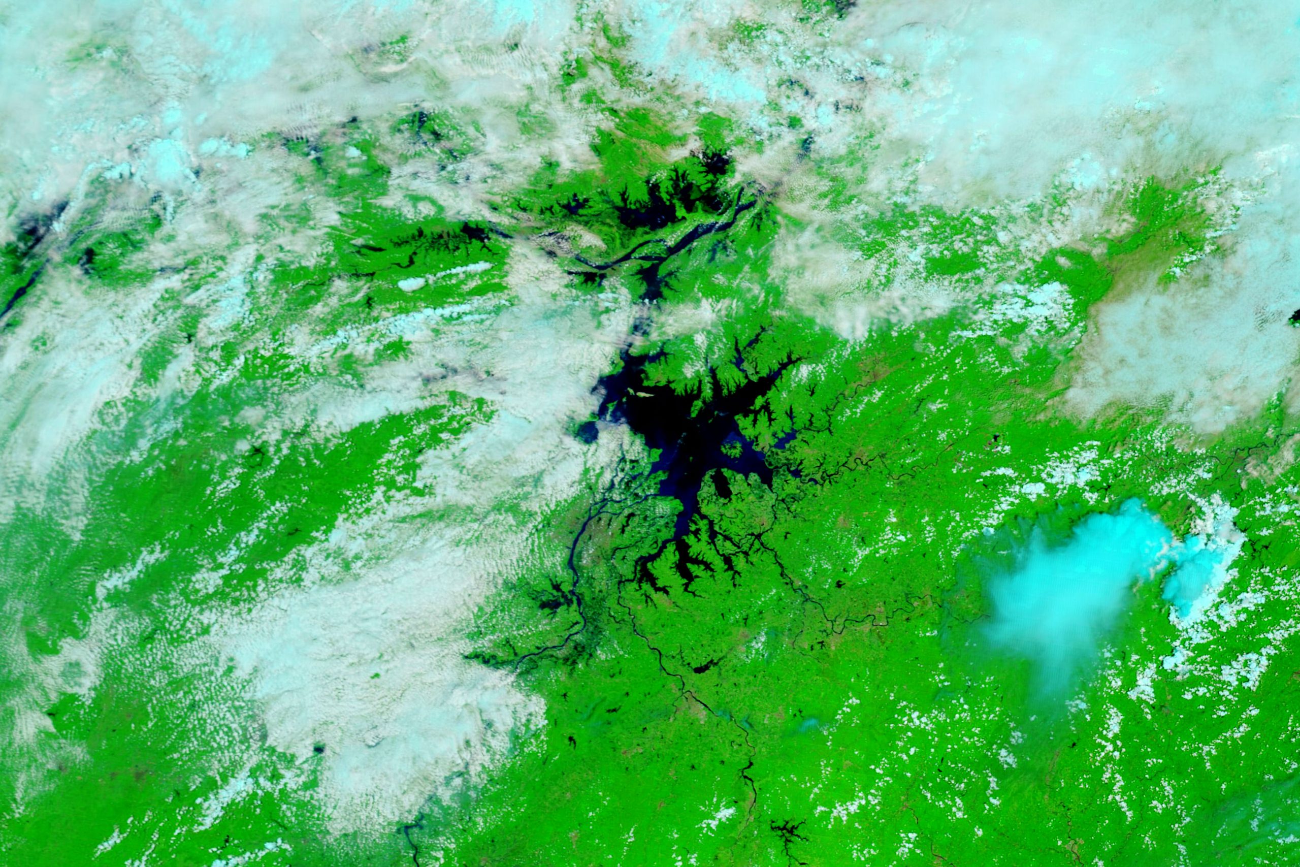 In this false color image, acquired with the Moderate Resolution Imaging Spectroradiometer (MODIS) on NASA’s Terra satellite, water appears dark blue or black and vegetation is bright green. The contrast makes it easier to distinguish between water and land.