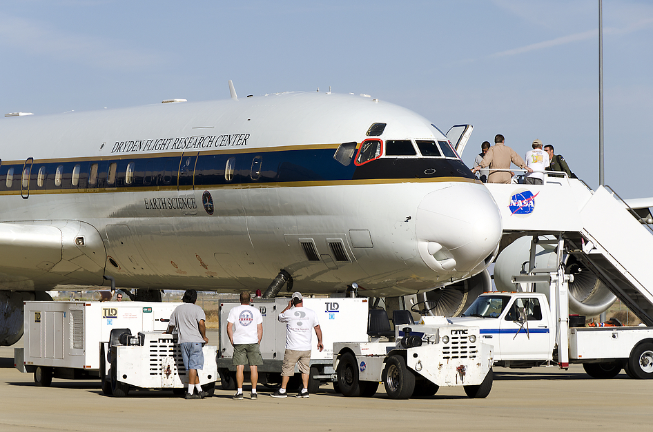 Pre-flight ECF #2 – The IceBridge DC-8 in pre-flight checks at NASA Dryden in California before an equipment checkout flight (ECF) over targets in the Mojave Desert. Credit: NASA/Michael Studinger