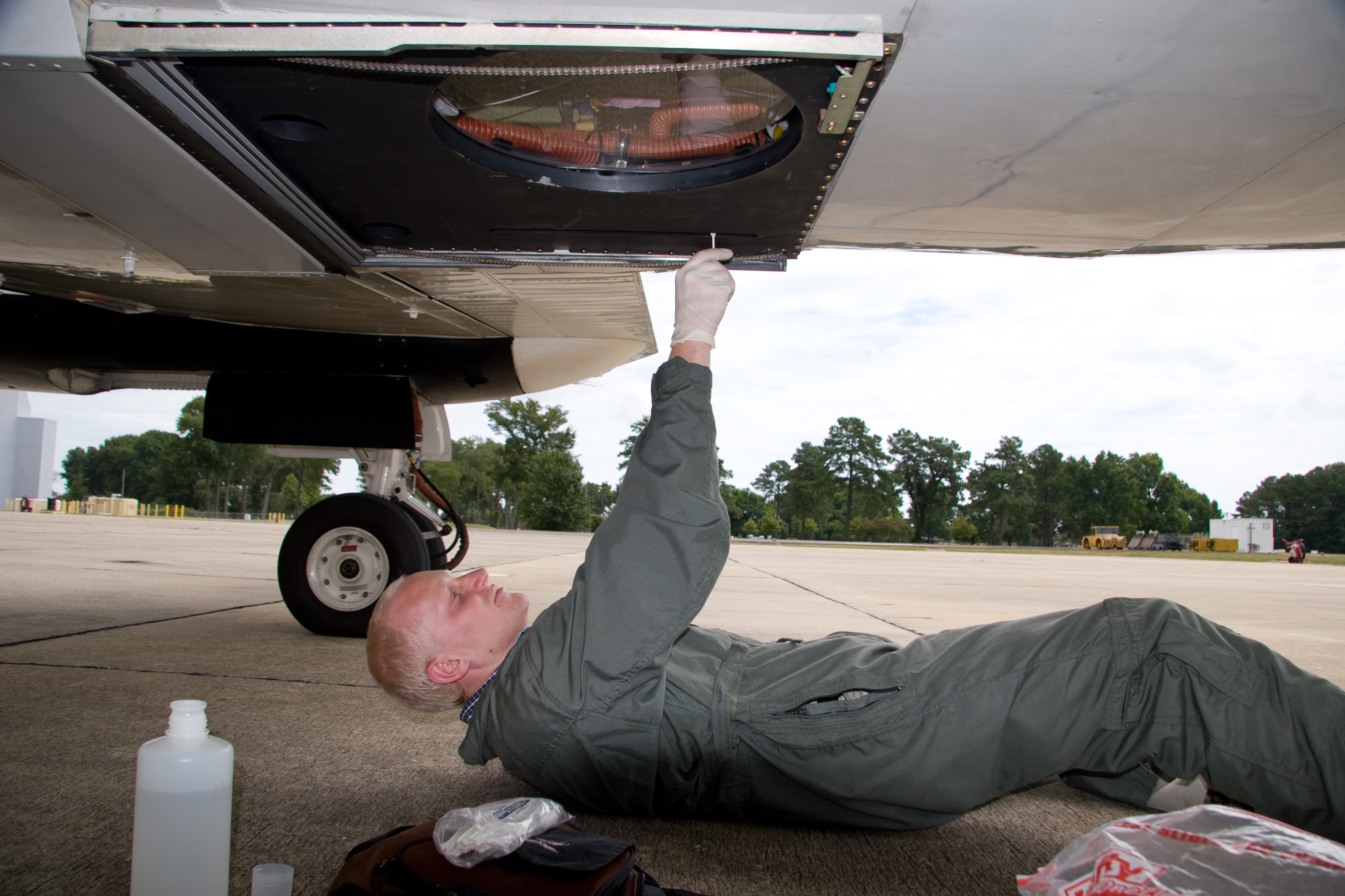 Preparing the B-200. Ray Rogers, member of an instrument operations team, cleans the glass on NASA’s King Air B-200. The glass allows a laser to emit a beam of light from below the aircraft toward the ground. The laser studies atmospheric particles called aerosols. Credit: NASA