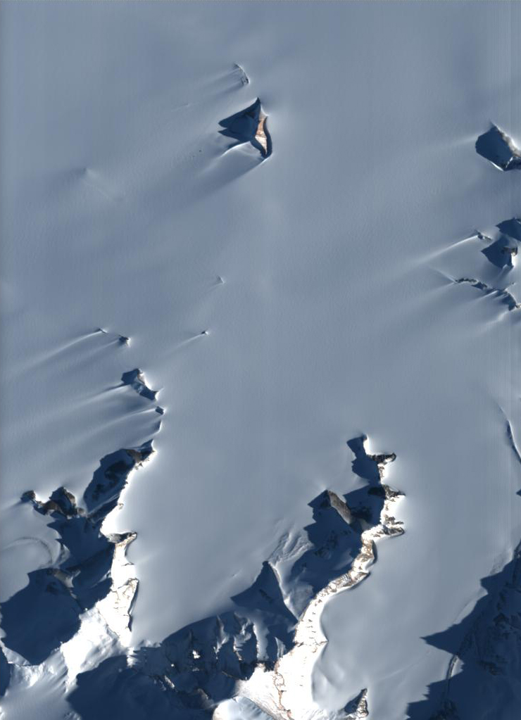 The topmost ridge in the image is the site of Belgium’s Princess Elisabeth Base, the first zero-carbon station on the Southern Continent. The ridge is subject to gales of up to 300 km/h, so the base is powered by wind turbines supplemented with solar panels.