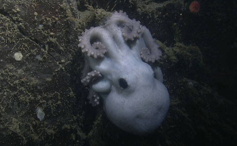 When the researchers first happened upon the octopus, it was attached to a ledge. They were sure it hadn’t been there during a previous dive, so this was their first sighting of it. And the animal seemed to be covering something with its body. What on earth could it be hiding? MBARI (Monterey Bay Aquarium Research Institute)/YouTube