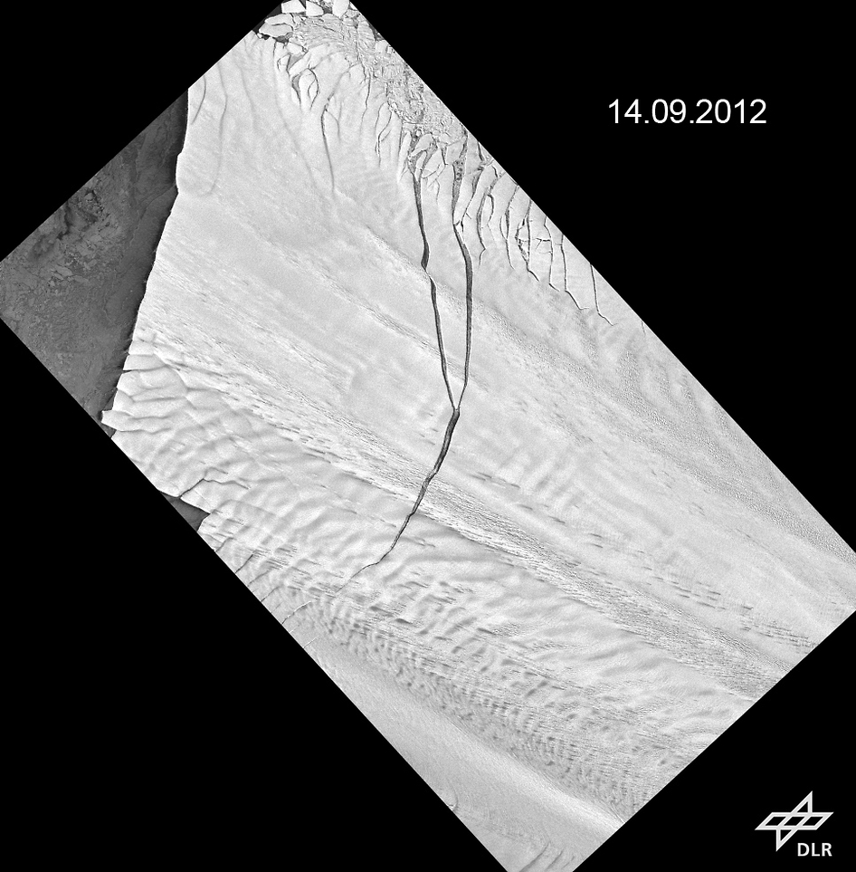 A synthetic aperture radar image of the Pine Island Glacier rift was taken by the German Aerospace Center’s TerraSAR-X satellite on Sept. 14, 2012. There have not been any changes to the glacier since that time. Credit: German Aerospace Center