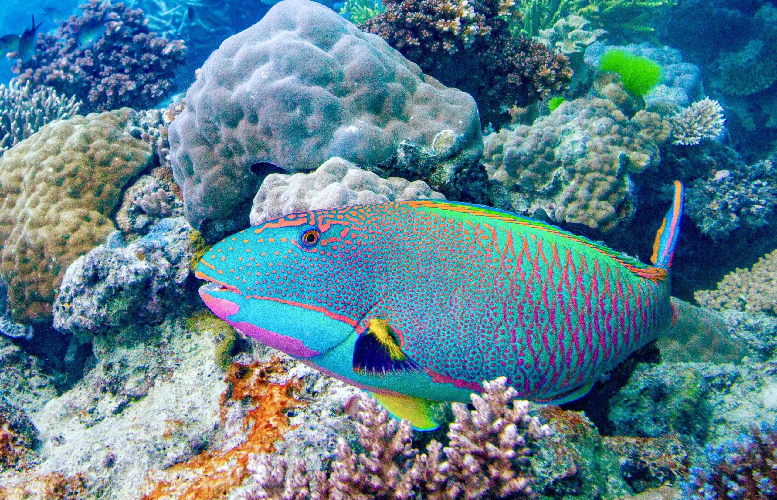Located in relatively shallow tropical waters, the parrotfish sports different colors depending on its gender. Female colors are less exciting shades of brown, green, and silver, while the males have bright colors such as aqua, orange, pink, yellow, red, and electric blue. Interestingly, the color roles are reversed in the Mediterranean, with the females wearing the more vibrant colors.