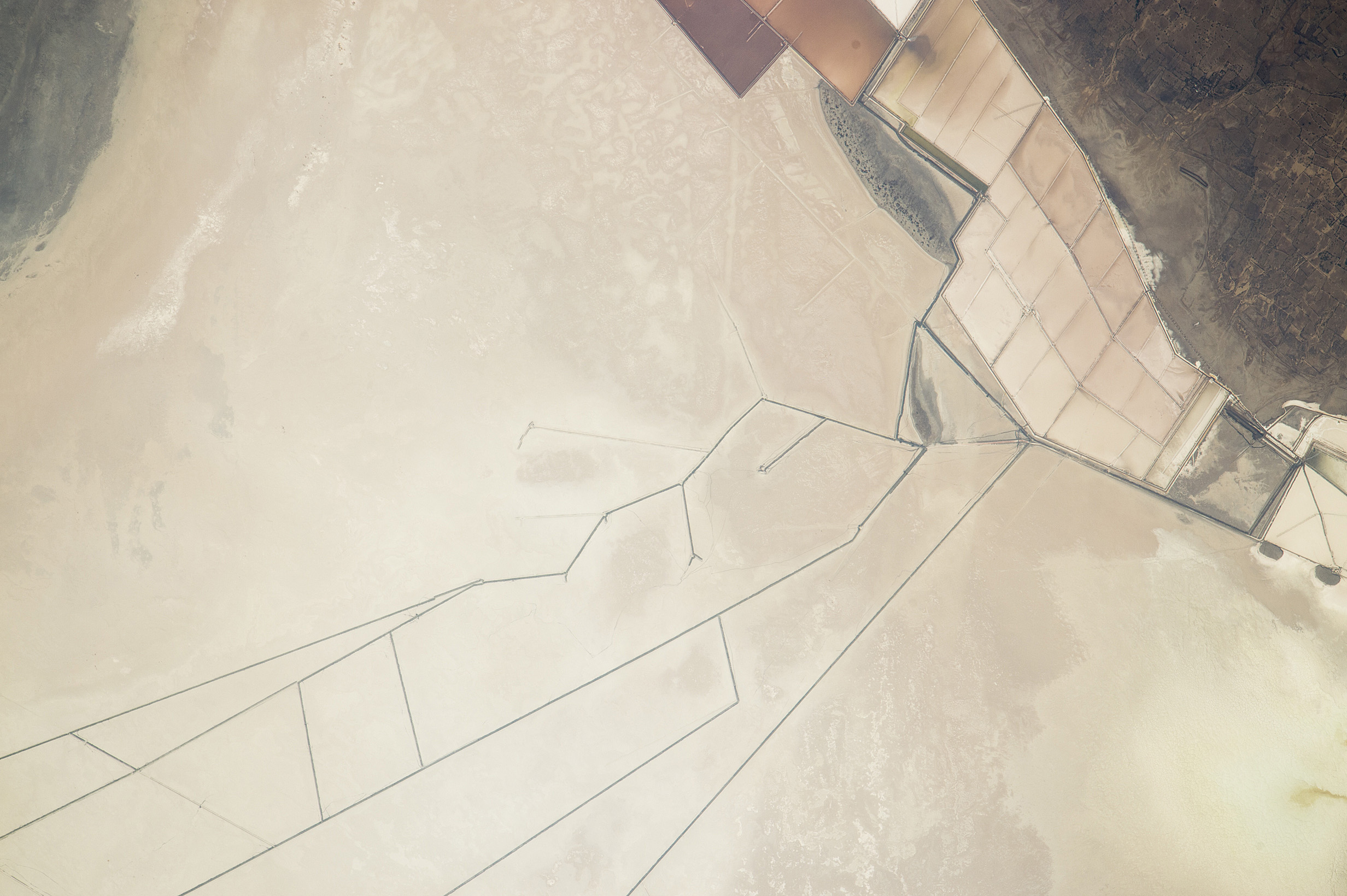 Angular evaporation ponds along the floor of the Rann are the heart of a major salt-producing industry. The straight lines across the image are ditches that help control the flow of salt-rich water. The scale is difficult to judge in this landscape of abstract shapes; in this case, the image shows an area roughly 16 kilometers (10 miles) wide. The light green tint (lower right) is shallow water from a small river that drains dark-toned farmland (top right).
