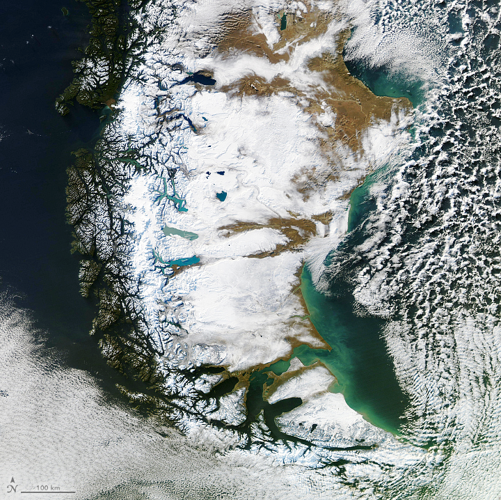 Rare view of Patagonia in South America. Today’s Image of the Day from NASA Earth Observatory features a rare, cloud-free view of Patagonia in winter.
