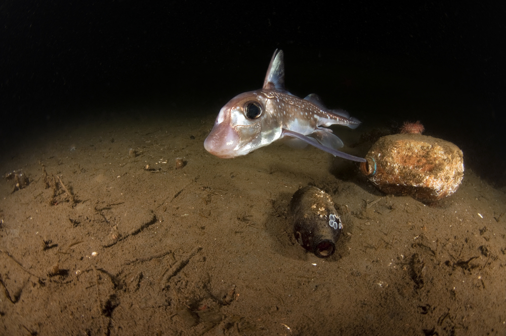 The ratfish is found in the north-eastern Pacific Ocean. Often seen by divers at night in the Pacific Northwest, this cartilaginous fish gets its characteristic name from a pointed rat-like tail.