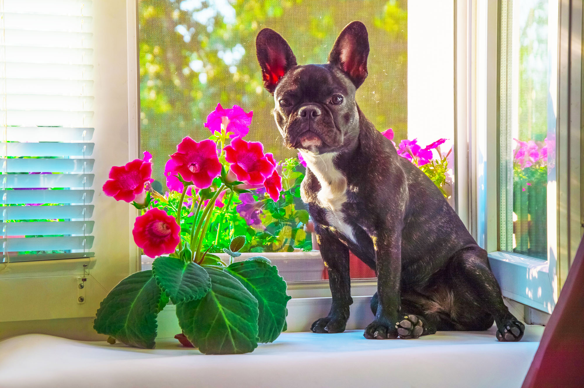 Red Sinningia speciosa Admired by French Bulldog. This red Sinningia speciosa, also known as gloxinia, is a member of the flowering plant native to Brazil within the family Gesneriaceae.