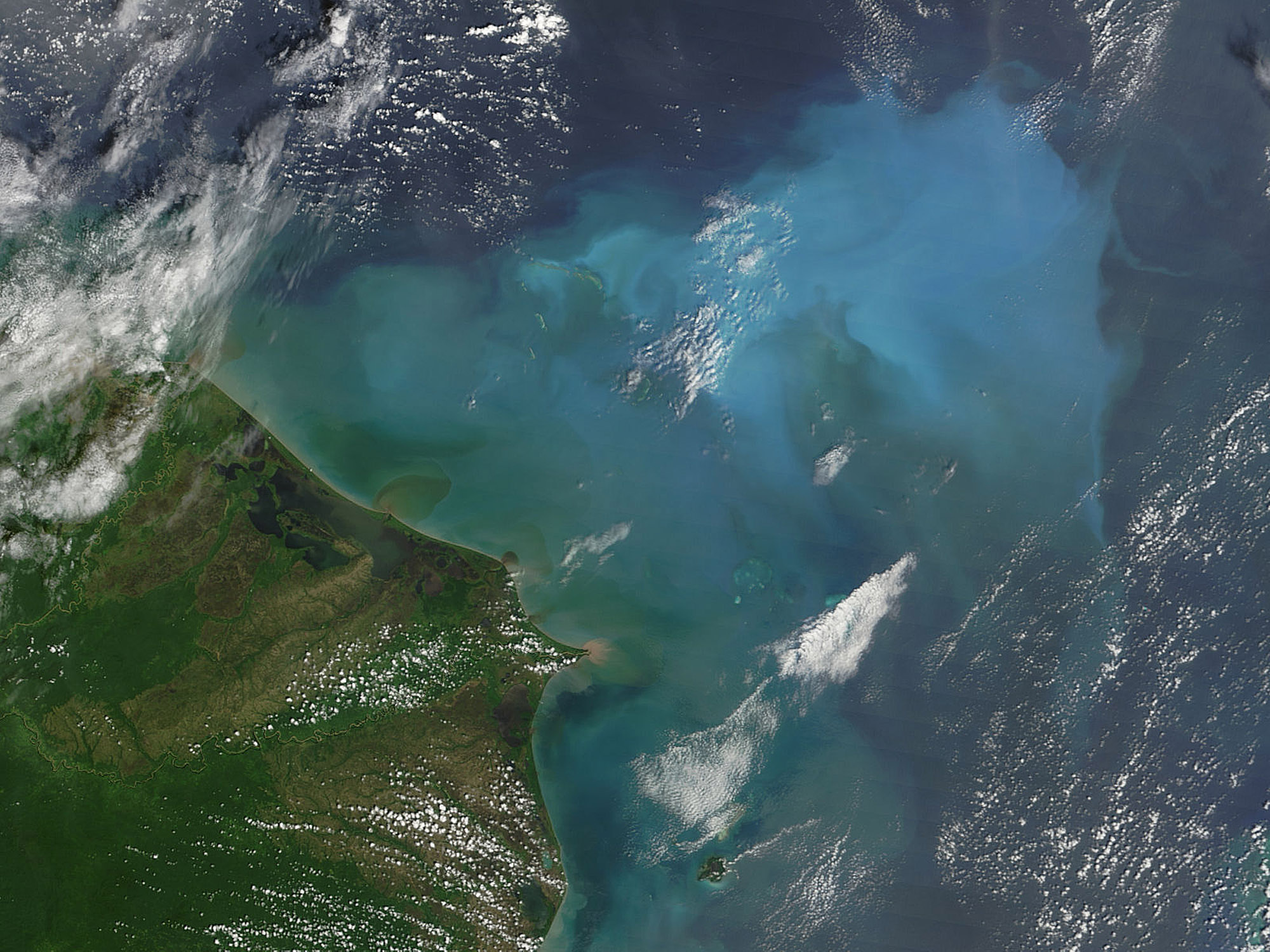 Ocean currents are the cause of the resplendent coloration seen in this image of the Caribbean coastline of Honduras. Sediments off Honduras from the land surface is carried by streams and deposited into the ocean. Deep undersea currents can sometimes bring them back to the surface.