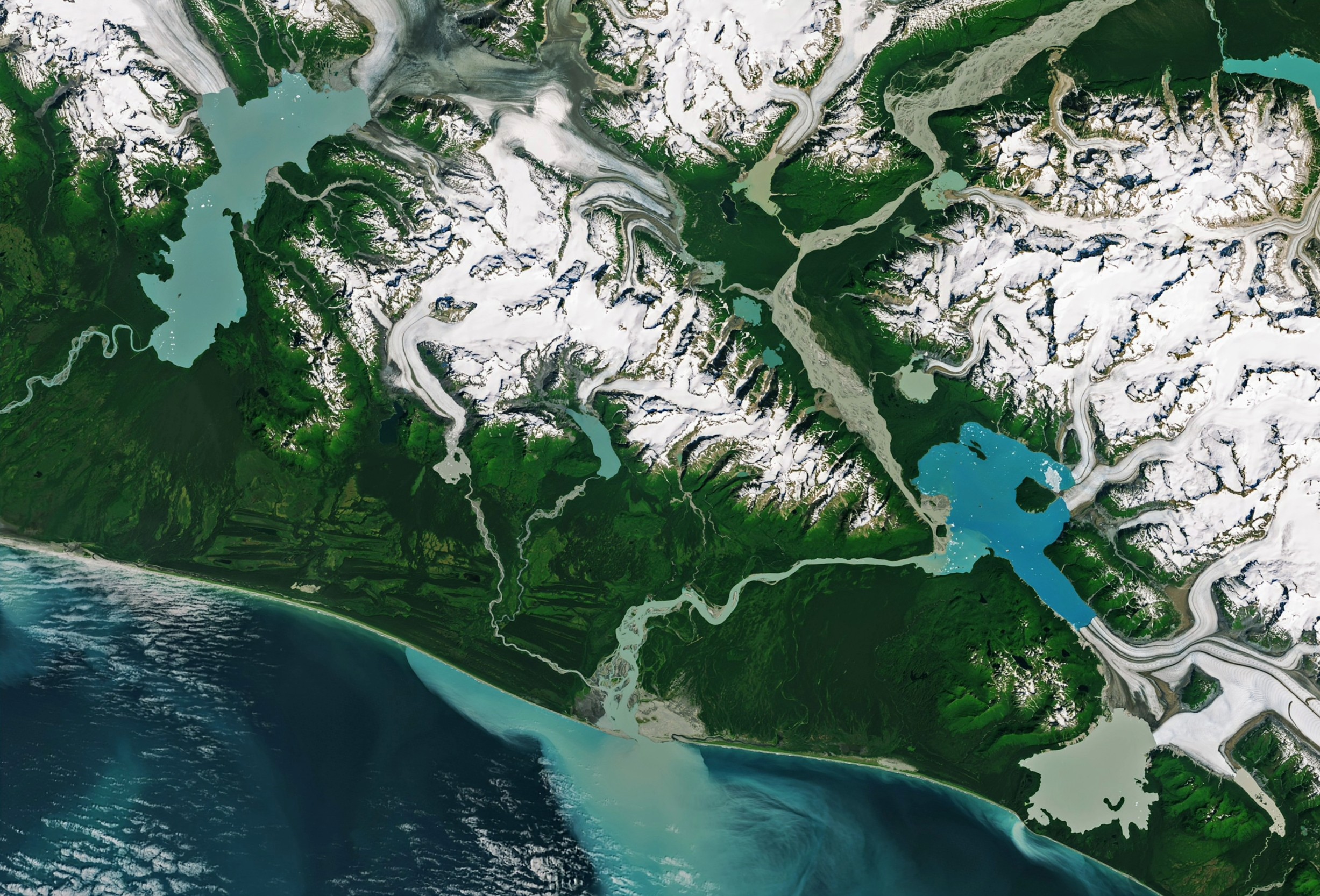 “A trio of glaciers – Yakutat, Alsek, and Grand Plateau – descend from inland mountains and flow onto the coastal plain southeast of Yakutat borough, ending at Harlequin Lake, Alsek Lake, and Grand Plateau Lake,” noted NASA.