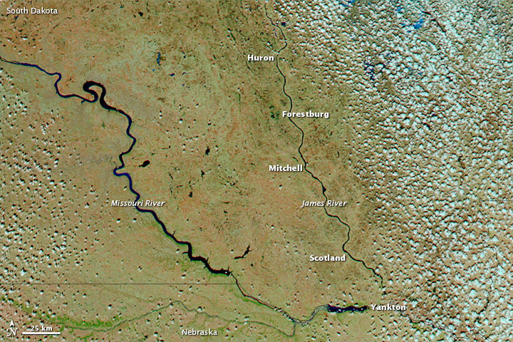 The most striking difference between March and April is the retreat of snow cover. Snow blankets most of the region on March 5, and very little snow remains a month later. The Missouri and James Rivers become much more conspicuous as spring progresses. In early March, the Missouri River appears mostly covered by ice while the James River is indistinguishable from the surrounding snow cover. A month later, both rivers are obvious, as are numerous small lakes. Partially obscured by clouds, standing water also appears in the northeast in early April (image upper right). While the Missouri River may give the appearance of being more swollen in the April 4 image, the AHPS flood warnings on April 5 pertained to the James River.