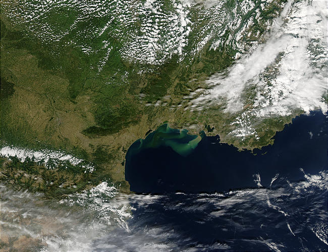 Silt displaced by the flooding is caught up in the waters of the Rhone and are deposited into the Golfe du Lion. The silt appears brown-green in the true-color imagery because of the way that sunlight reflects off of it. Also its pattern of streaks and clouds is due to currents in the water. Therefore Eventually, after the flooding stops carrying so much silt to the Golfe. And the silt will disperse and the waters will return to their predominantly blue-black color.