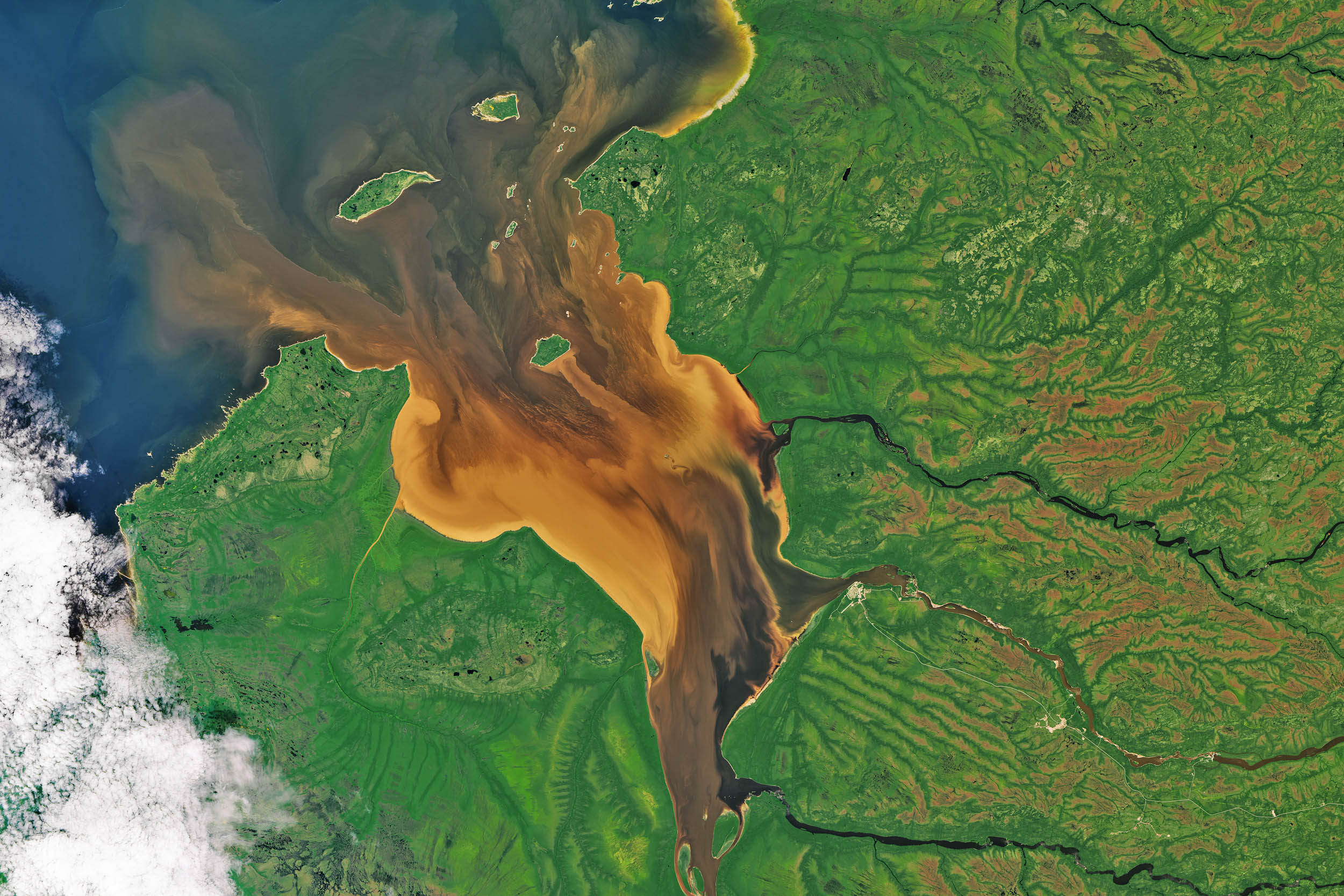 Remote Rupert Bay in northern Quebec is a place where the majesty and dynamism of fluid dynamics is regularly on display. With several rivers pouring into this nook of James Bay, the collision of river and sea water combines with the churn of tides and the motion of currents past islands to make swirls of colorful fluid that could impress even the most jaded of baristas.