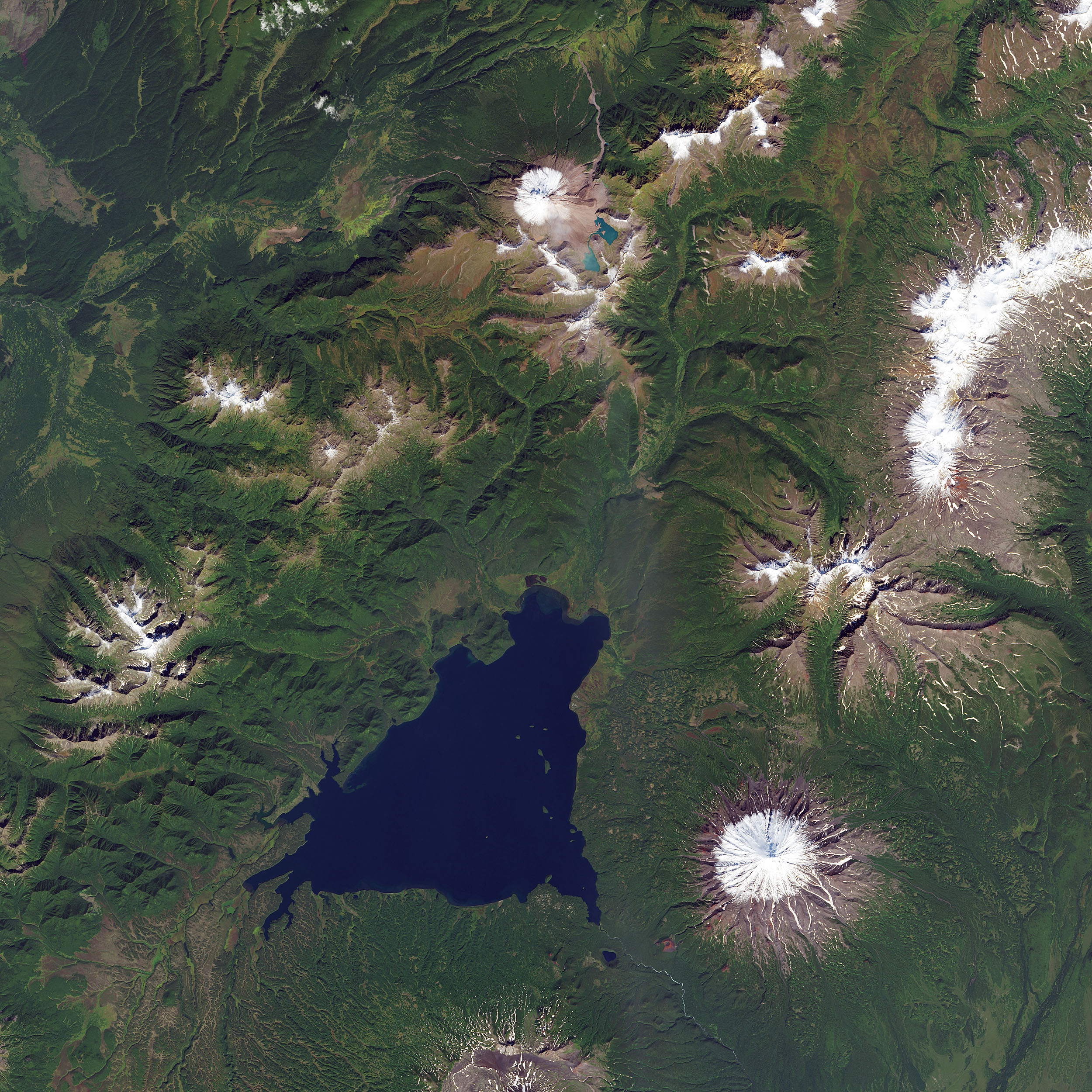 Russia’s Kizimen Volcano. Despite 9 months of continuous activity at Kizimen Volcano, seasonal changes from early fall 2013 (top) to late spring 2014 (lower) dominate the landscape. Located on Russia’s subarctic Kamchatka Peninsula, summers are short at Kizimen.
