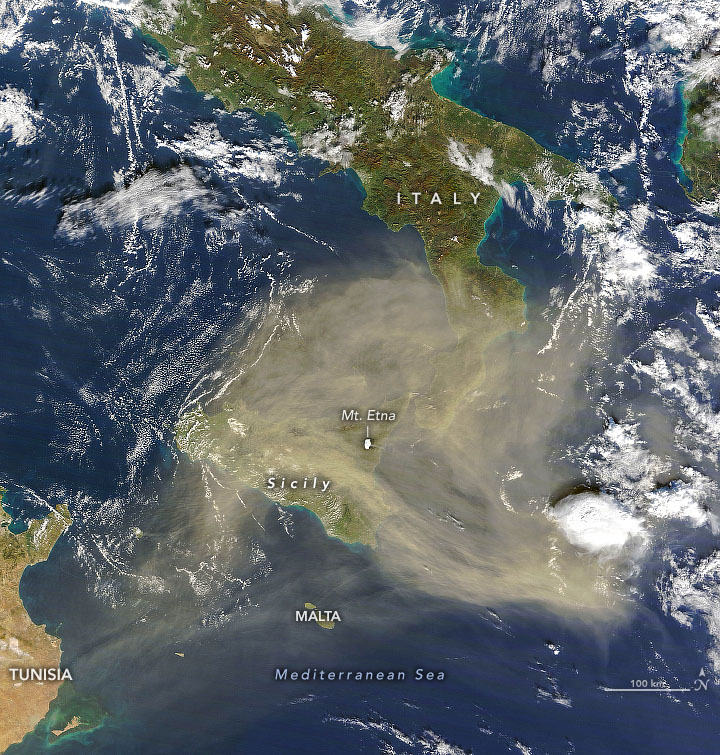 “The thick haze obscured Behncke’s ground-based view of Mount Etna, 20 kilometers (12 miles) away. However, a close look at the satellite image reveals a snow capped peak surrounded by a ‘halo’ of clear air. Behncke thinks this suggests that the dust was relatively low in altitude.”