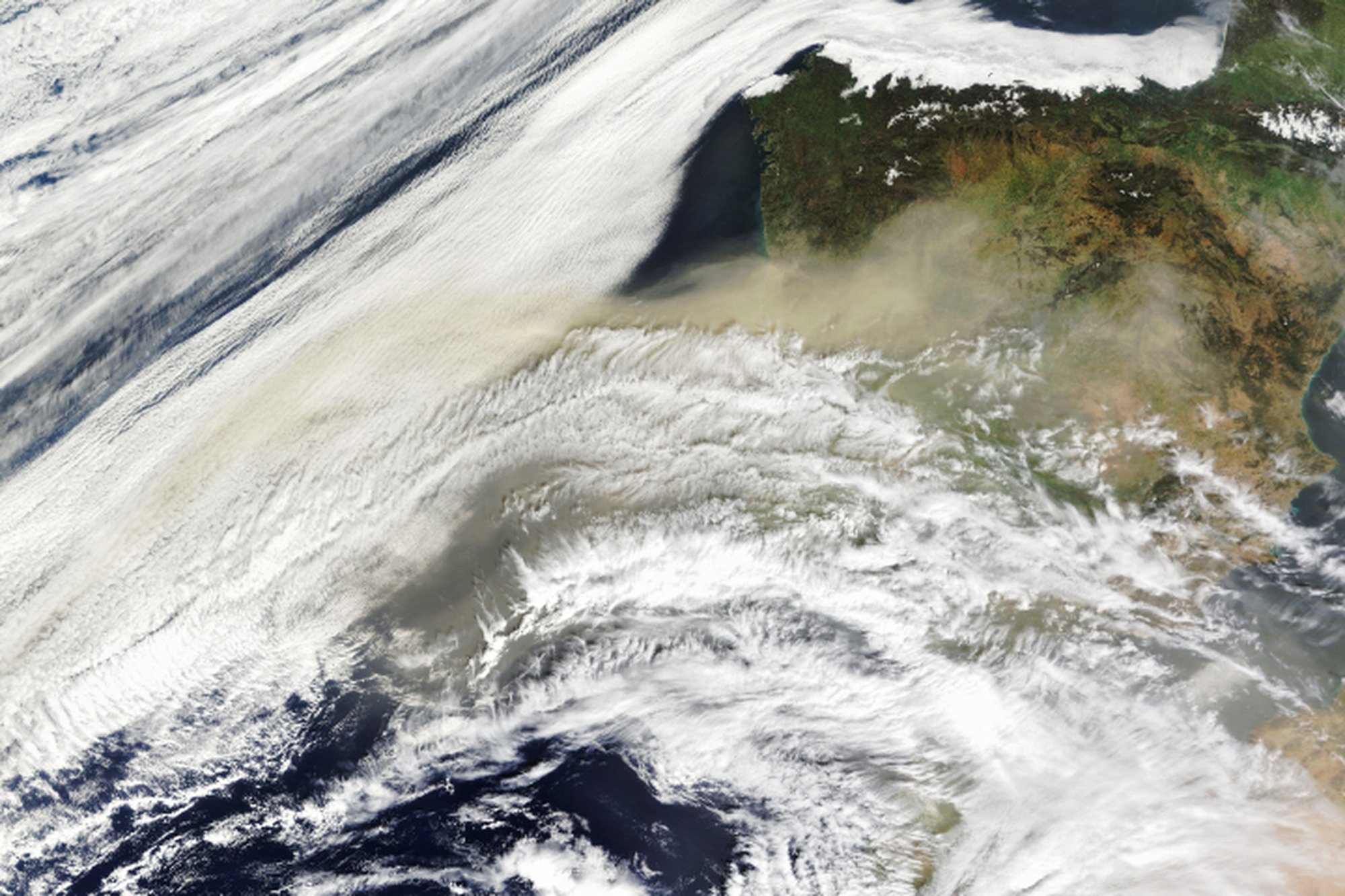 “The MODIS (Moderate Resolution Imaging Spectroradiometer) on NASA’s Terra satellite captured this image of dust enveloping the Iberian Peninsula on March 22.”