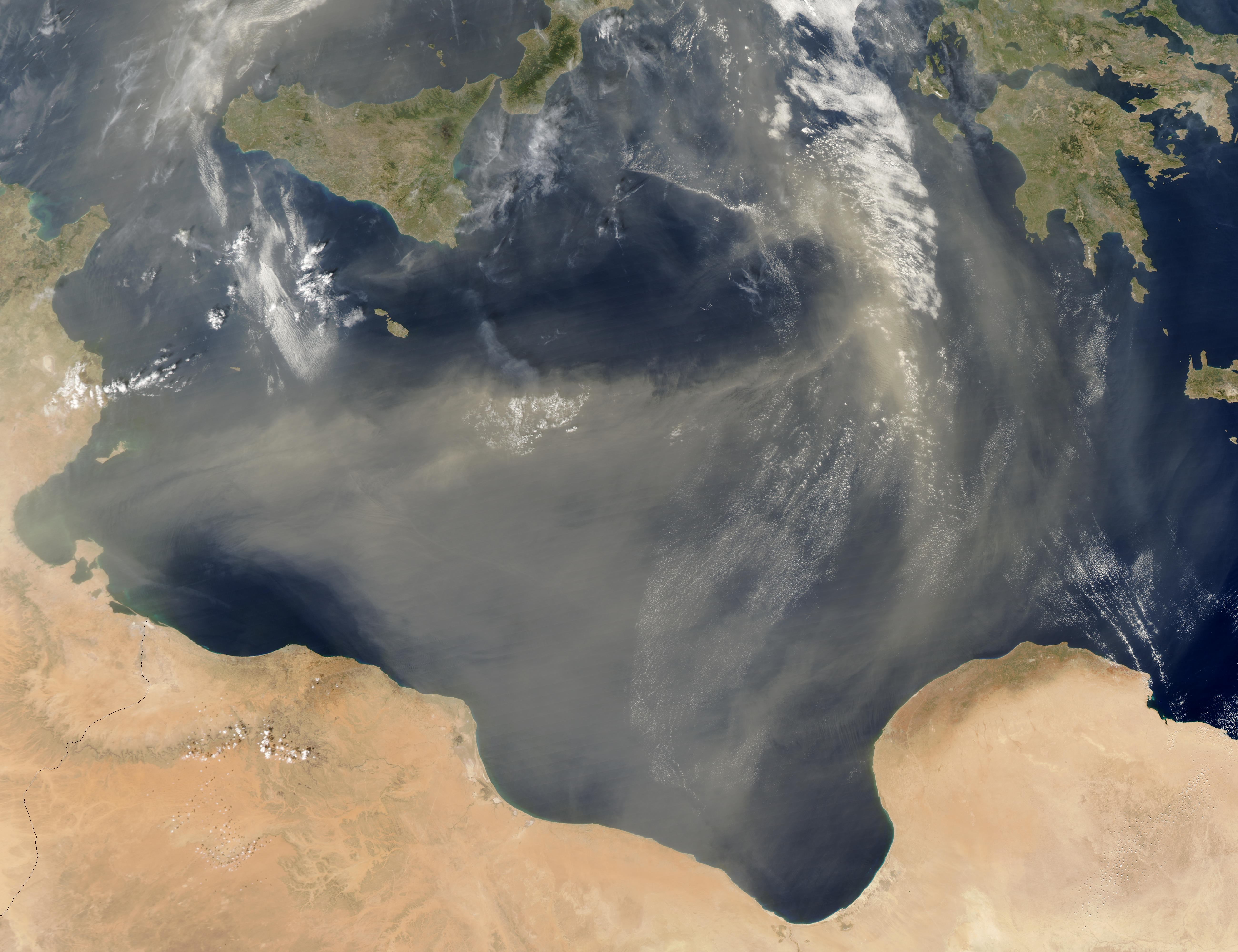 Saharan Dust off Libya and Tunisia. A large plume of Saharan Desert dust (tan pixels) was blowing northward off the coast of Libya and spreading over much of the Mediterranean Sea on October 3, 2003. This true-color image was acquired by the Moderate Resolution Imaging Spectroradiometer (MODIS) aboard NASA’s Aqua satellite.