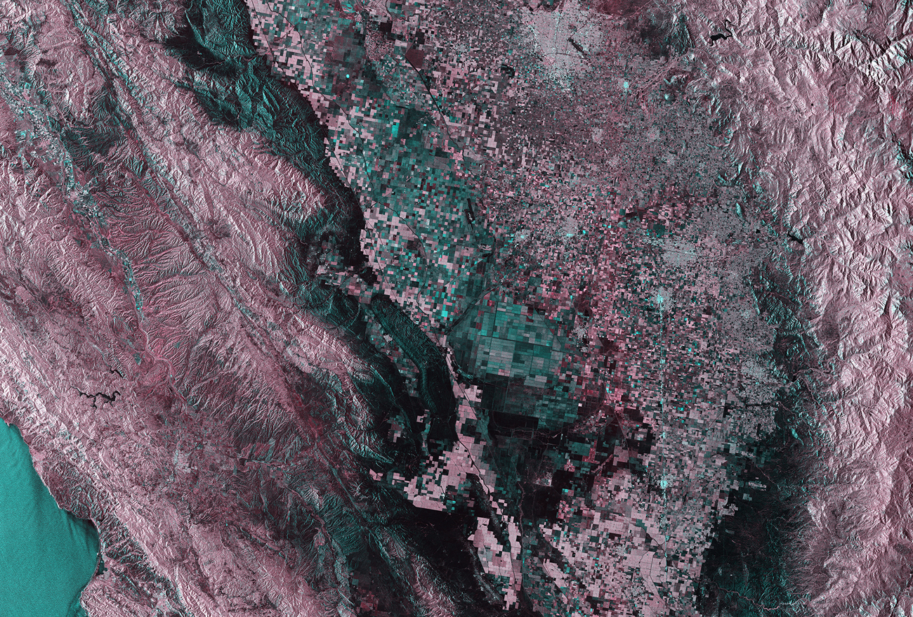 East of the Ranges is the San Joaquin Valley, where we can see the geometric shapes of large-scale agricultural production. Major crops include grapes, cotton, nuts and fruits, with productivity relying on irrigation from surface water diversions and groundwater pumping from wells.