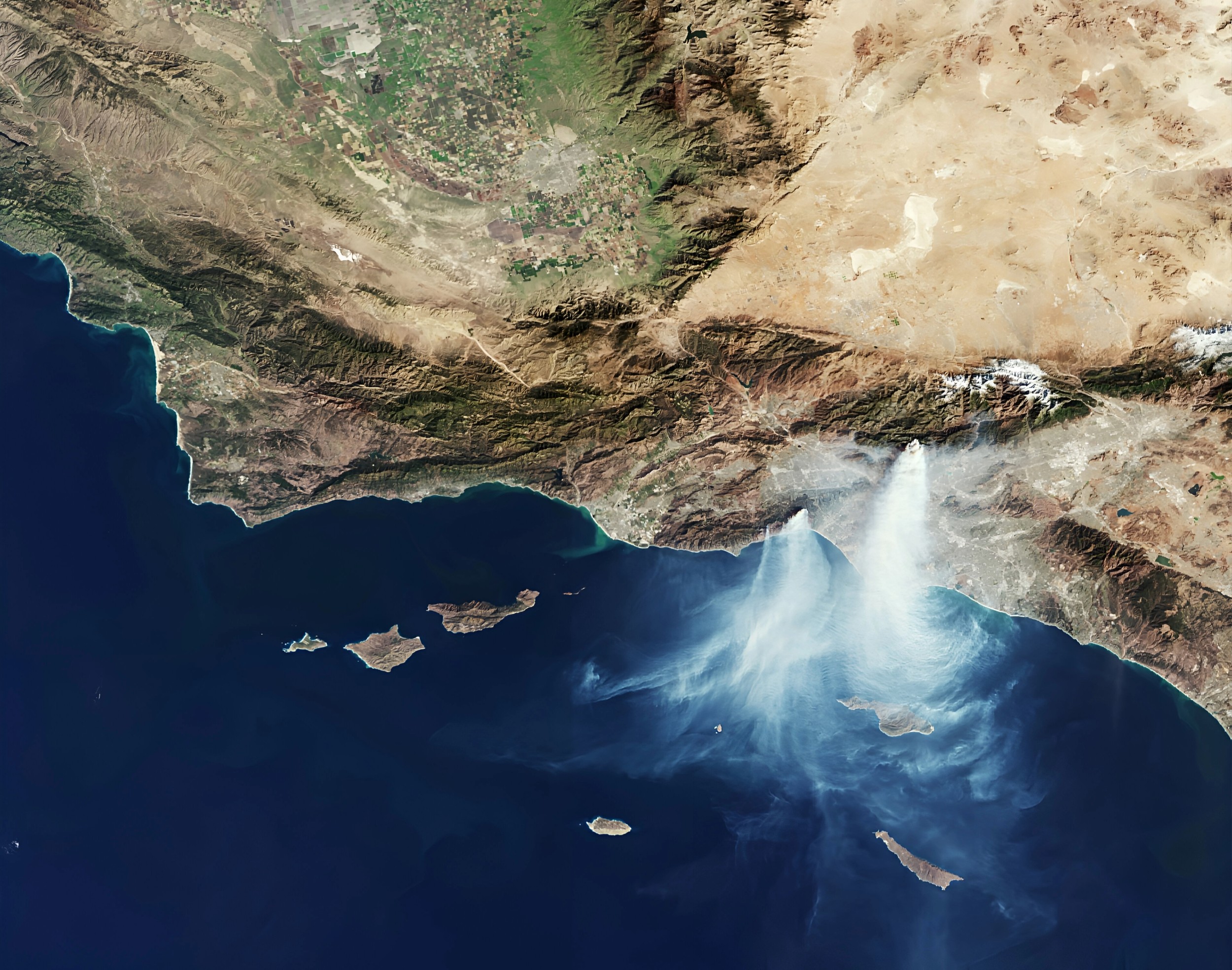 “This image, captured by the Copernicus Sentinel-3 mission on January 9, 2025, shows the Palisades fire at lower left and the Eaton fire at upper right, with smoke seen reaching Catalina Island and the Santa Barbara reserve to the south of the fire.”