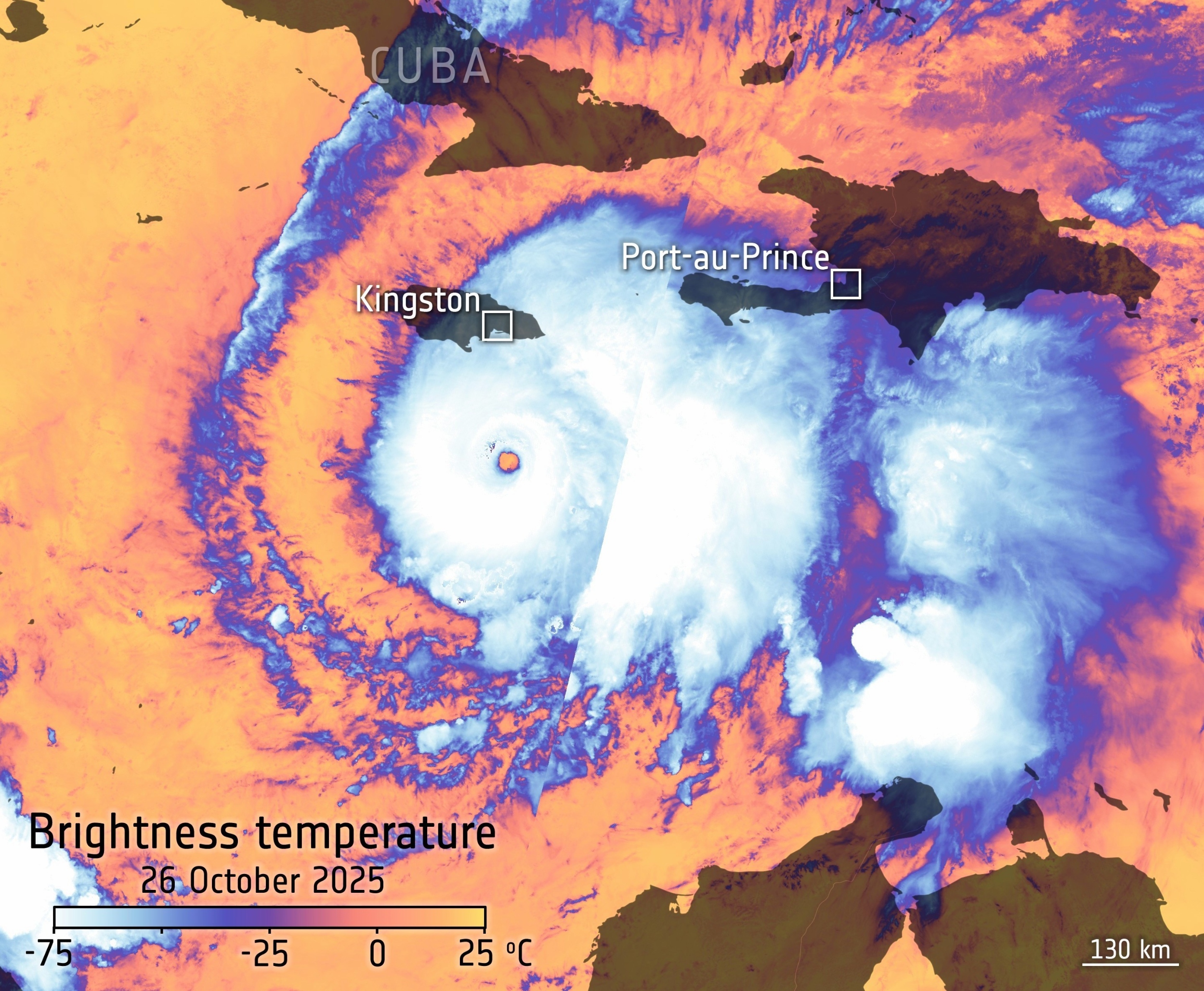 The image was captured by the Copernicus Sentinel-3 satellite on October 26, 2025, as the storm churned across the Caribbean Sea toward Jamaica.