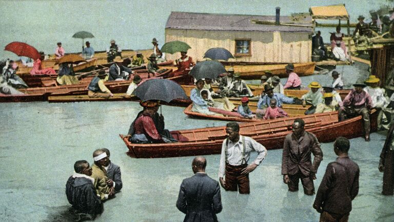 In this colorized image published in postcard form in 1906 or 1907, the faithful have gathered for an open-air baptism on the Mississippi River. The Mississippi, at about 2,320 miles North America’s longest river, was a vital artery for life in the South, representing a major transport route for people and goods. But as we see here, it also had an important spiritual role to play as well. Photo Credit: Transcendental Graphics/Getty Images