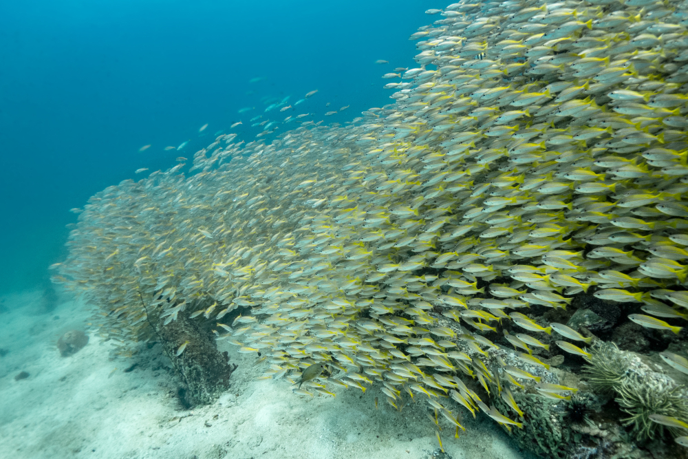 A large school of yellowtail rockfish parade over the seafloor.he body of the yellowtail rockfish is elongate and compressed.