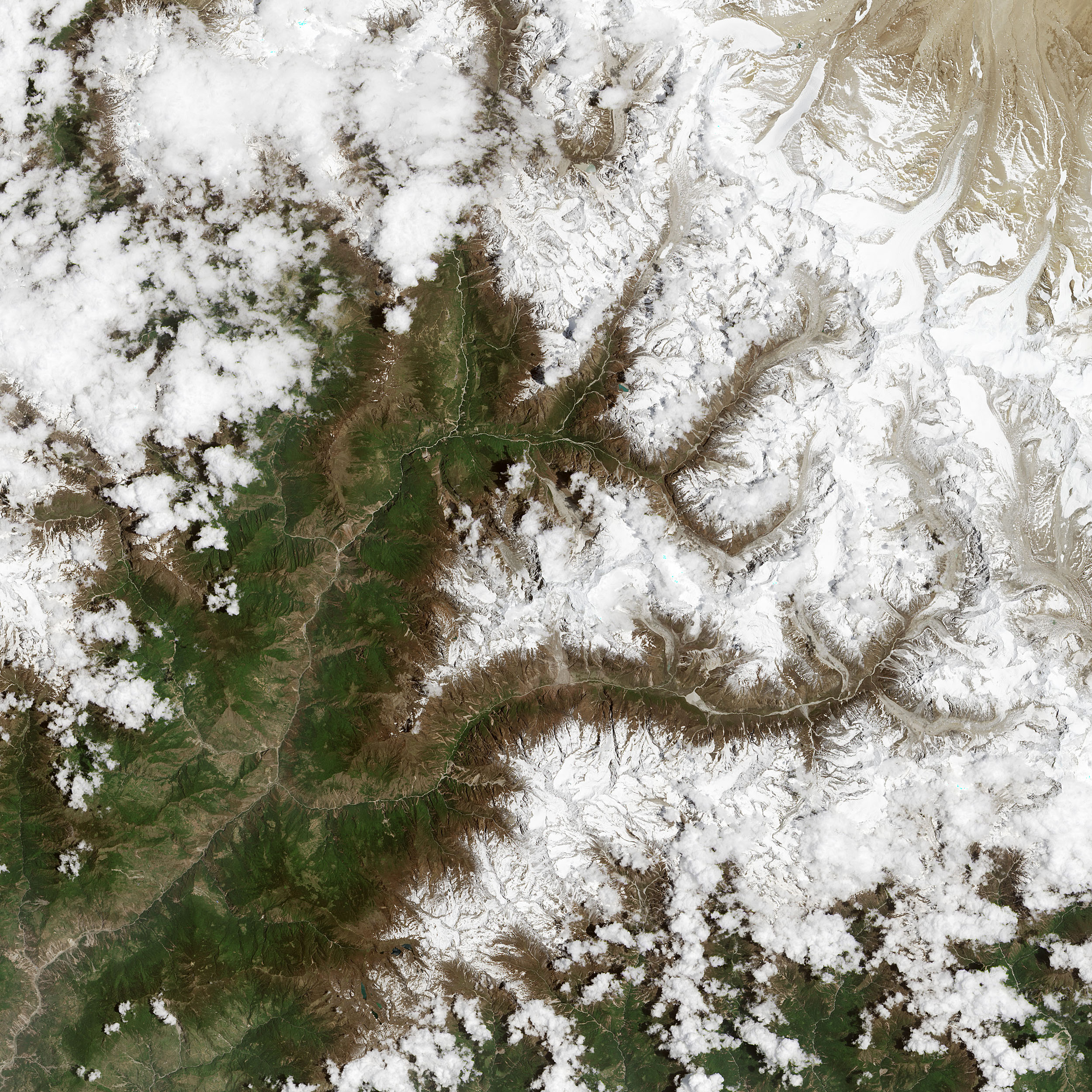 The NASA-sponsored team is using satellite images to identify landslide locations, to characterize additional hazards (for example, dammed lakes), and to incorporate other useful information such as locations of nearby villages. Data sources include the Landsat satellites, the Earth Observing-1 satellite, the Advanced Spaceborne Thermal Emission and Reflection Radiometer (ASTER) instrument on the Terra satellite, the WorldView and GeoEye satellites operated by Digital Globe, and image mosaics and topographic information accessible in Google Earth. As an example, the third image above is a natural-color view of the study area that was acquired by Landsat 8 on June 1, 2015.