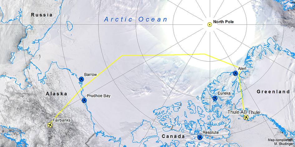 The two most important sea ice flight from Greenland to Alaska every year are two crossings of the entire Arctic Basin, north of Greenland and Canada all the way to Alaska. A challenge comes from predicting the weather in such a remote area. We have infrared satellite images and computer models available, but these models cannot be validated because there are no weather stations in the Arctic Ocean. Also, neither the forecast models nor satellite images show the weather features that are most important to us: low clouds and ice fog that disrupt the laser and camera measurements. IceBridge flight from Thule, Greenland to Fairbanks, AK that surveyed sea ice along a transect over the entire Arctic Basin. Basemap is MODIS satellite image showing cloud cover and sea ice over the Arctic Ocean. Credit: NASA/M. Studinger