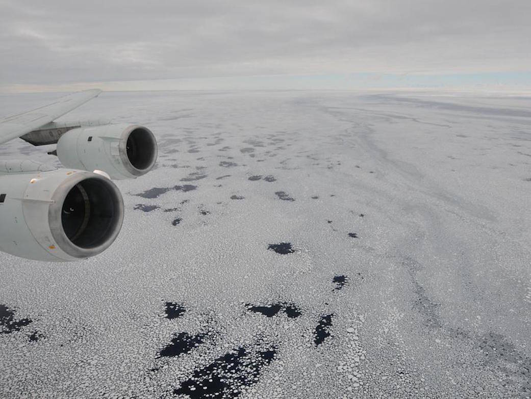 Sea ice is seen out the window of NASA’s DC-8 research aircraft on Oct. 21, 2009, as it flies 2,000 feet above the Bellingshausen Sea in West Antarctica. This was the fourth science flight of NASA’s Operation Ice Bridge airborne Earth science mission to study Antarctic ice sheets, sea ice and ice shelves. Credit: NASA/Jane Peterson