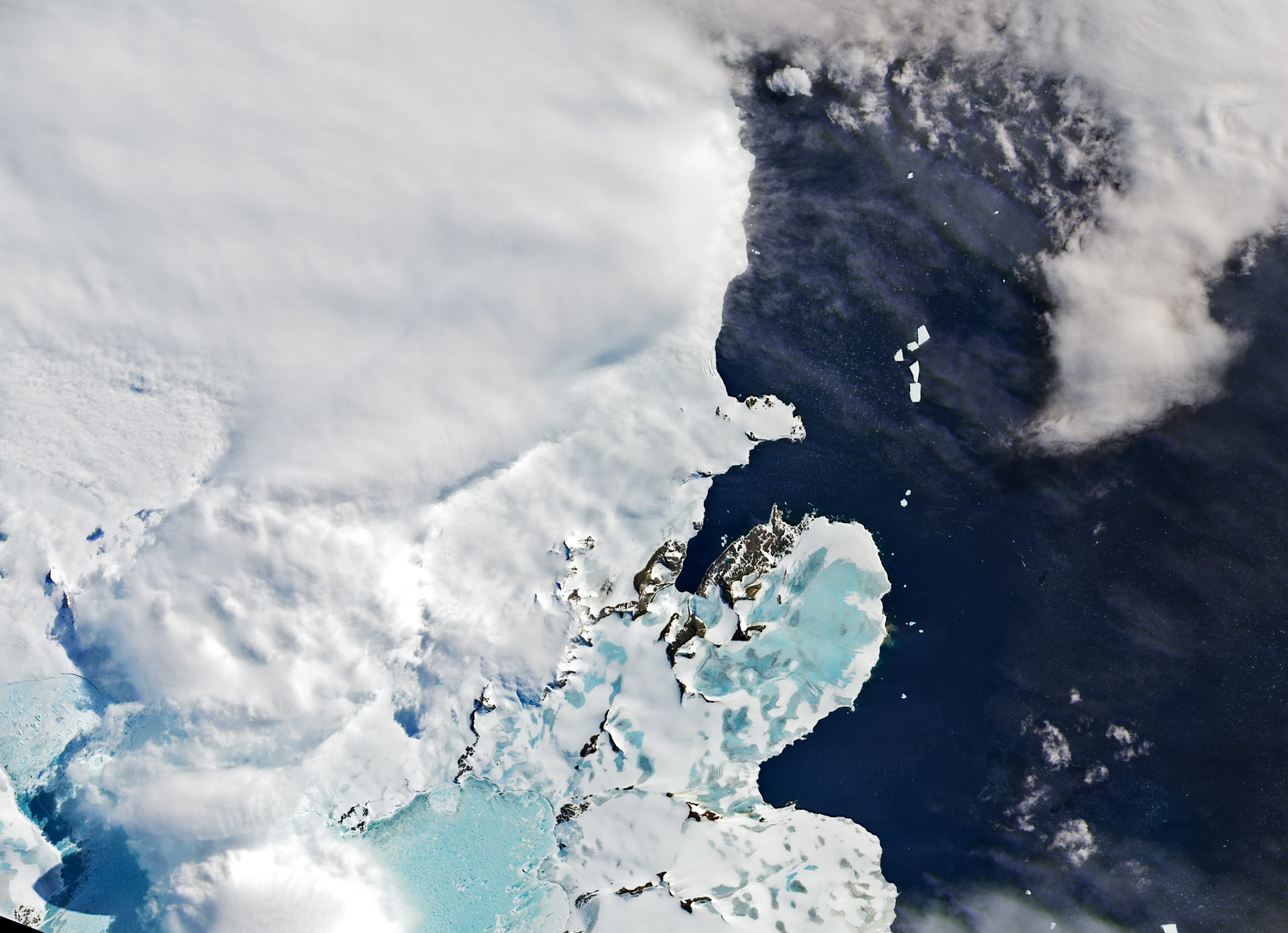 The sea ice anchored to the coast appears light blue where the surface ice has melted, while the white ice farther off the coast is a combination of broken sea ice and small icebergs. Sea ice melts early along the Antarctic Peninsula