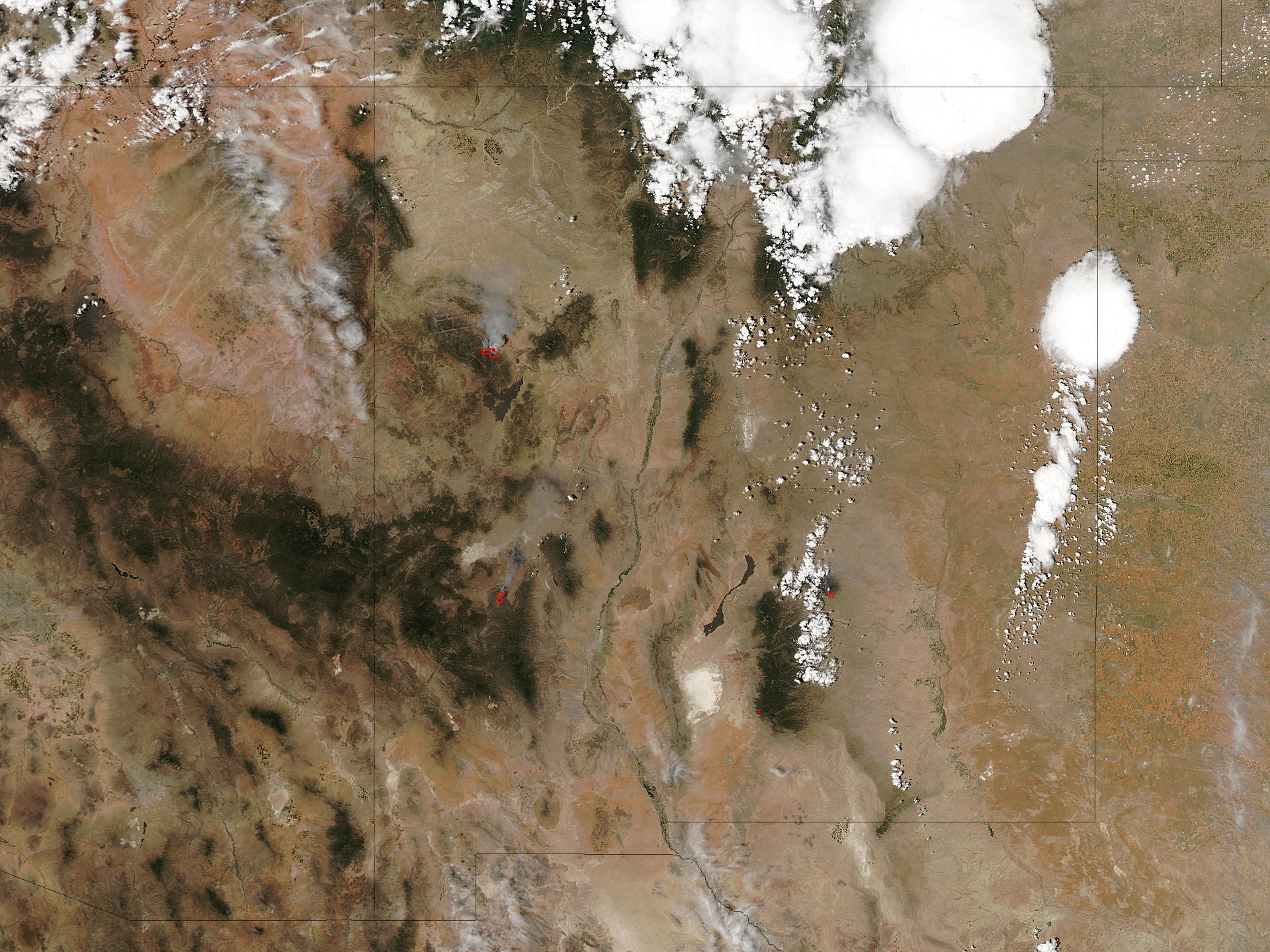 Sedgwick Fire in New Mexico. On June 15, 2004, the Moderate Resolution Imaging Spectroradiometer (MODIS) on NASA’s Aqua satellite captured this image of New Mexico, showing the Sedgwick Fire (top) in the Cibola National Forest, as well as a smaller, unnamed fire to the south (bottom). Pixels in which MODIS detected fire are outlined in red.