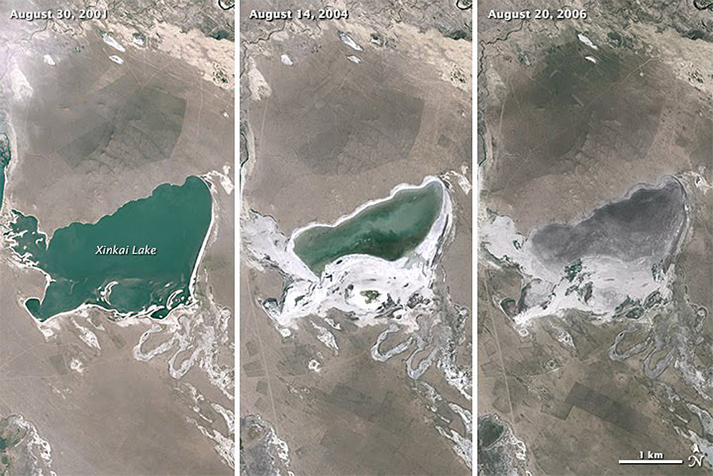 Xinkai Lake, which is located in northern Inner Mongolia near the Russian border, offers a good case study. As shown in the Landsat imagery at the top of the page, what was a sizable lake in 2001 was dry by 2006. A lobe of the larger Hunlun Lake (also known as Dalai Lake) during wet years, Xinkai has a history of shrinking during dry spells. Hotter temperatures, particularly during the fall, have taken a large toll on Dalai since 2000, other researchers have shown. In addition, nearby mines are thought to be siphoning out significant amounts of water from Dalai and lowering the area’s water table.