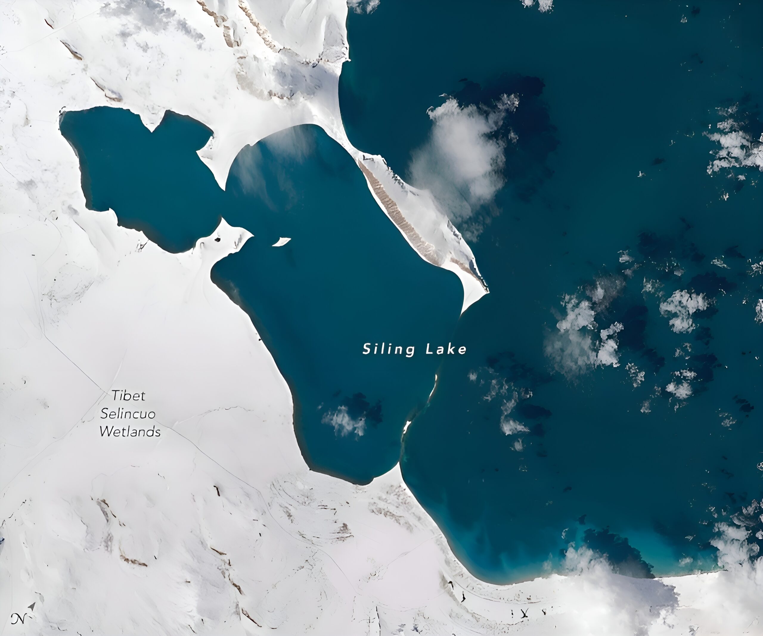 “Located at an elevation of approximately 4,500 meters (14,860 feet), Siling Lake is a high-altitude endorheic lake, which means that it does not drain through any outlets,” said NASA.