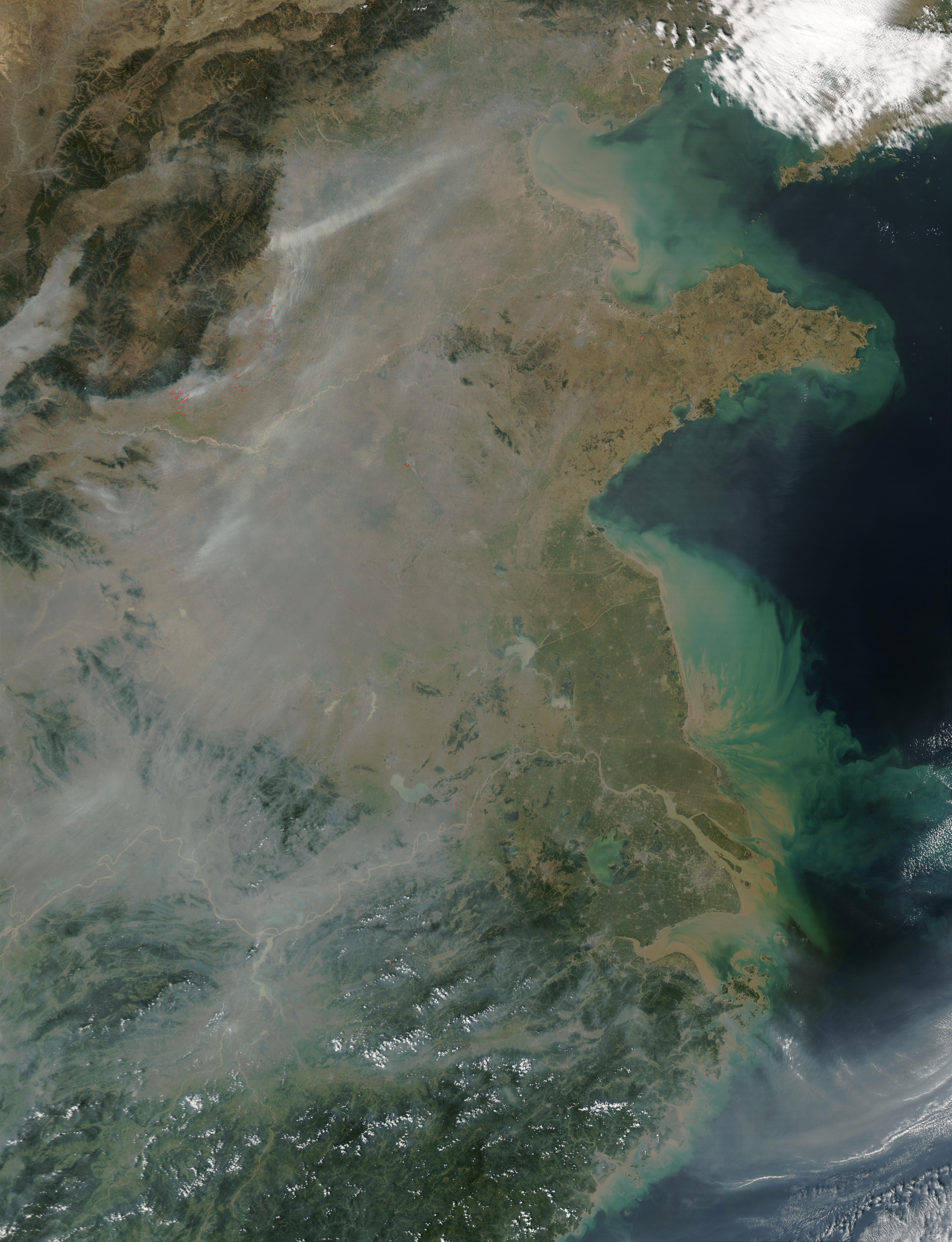 Smoke from several fires (red dots) and air pollution blankets eastern China in this true-color Moderate Resolution Imaging Spectroradiometer. (MODIS) image from October 2, 2002. Bo-Hai Bay is at upper right, and two large Chinese rivers are visible. Therefore the Yellow River (north of center) and the Yangtze River (south of center). You can see the massive amount of Smoke and Pollution in Eastern China In the image. A very smoggy and smokey city. Major smoke damage and fire damage as well does a huge mark on this city.
