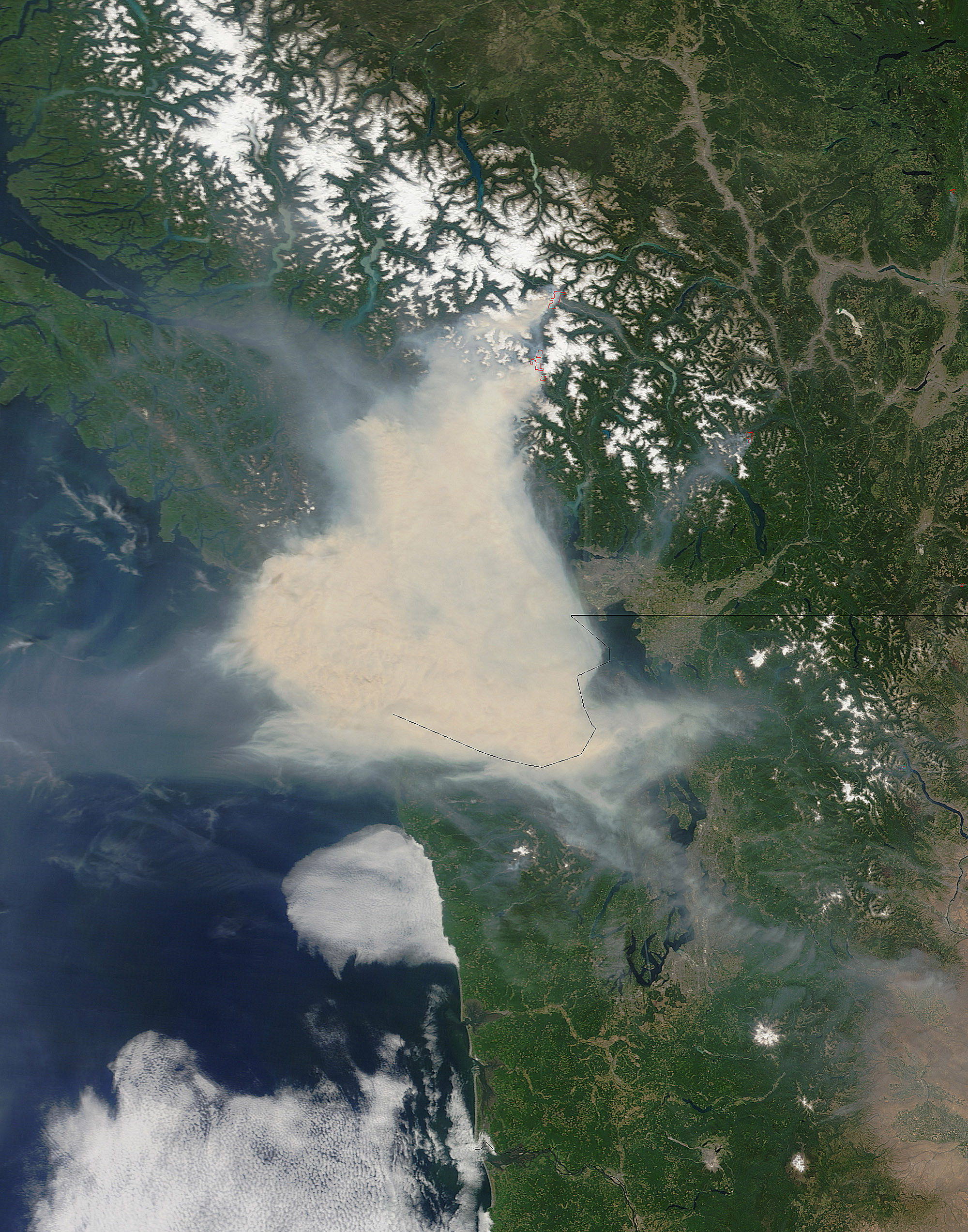 In the images, the principal source of the smoke appears to be fires burning 100 to 150 kilometers north of the city of Vancouver and roughly 50 to 70 kilometers north and west of Pemberton and the ski resort area of Whistler. The Elaho Valley fire was sparked by lightning in mid-June 2015, and stayed relatively small and contained until it started growing vigorously on July 4. By the morning of July 7, the fire and its scar covered about 20,000 hectares (50,000 acres), and the blaze was uncontrolled on all fronts. Fire managers reported crown fires—blazes high in the forest canopy that can leap across areas quickly when fanned by winds. Thick smoke and gusty winds prevented airborne firefighting flights on July 6, according to news reports.