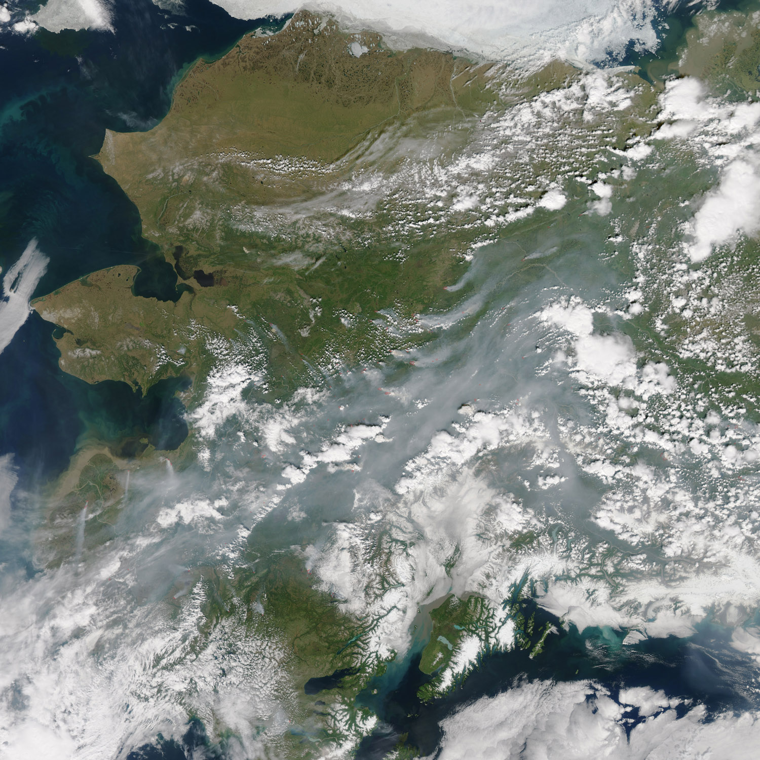 Still, firefighters have made progress on some Alaskan fires including the Sockeye fire, about 350 kilometers (220 miles) southwest of Fairbanks (obscured by clouds in this image). That fire was 90 percent contained, according to a report issued on June 23. However, the report also noted that the weather forecast called for warm and dry weather, which could mean even more smoke. Smoke in Fairbanks and Interior Alaska shown in image has spread fairly wide over the area. Therefore will cause change in the lush.