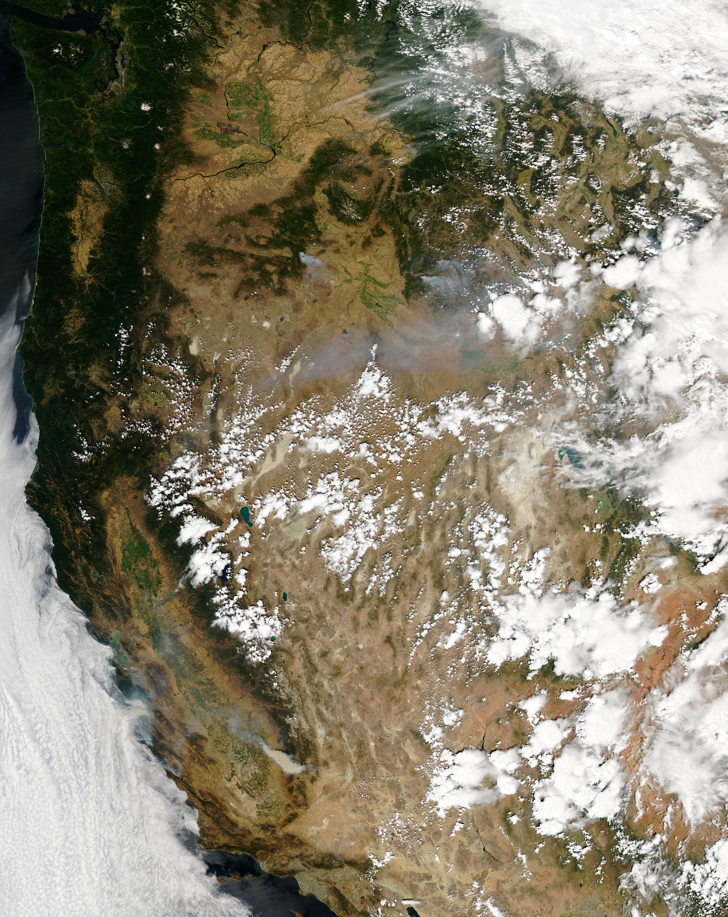The study comes as dozens of wildfires are burning across the western United States. The mosaic above and image below were acquired by the Moderate Resolution Imaging Spectroradiometer (MODIS) on NASA’s Aqua satellite on August 18, 2016. In the top image, red boxes mark the locations where MODIS detected warm surface temperatures associated with fire. Smoke plumes hang over several parts of California, Oregon, Idaho, and Washington; smoke is usually gray while clouds are brighter white. The close-up below shows the smoke pall from the Soberanes fire (upper left) and the Cedar fire (middle right) in California.