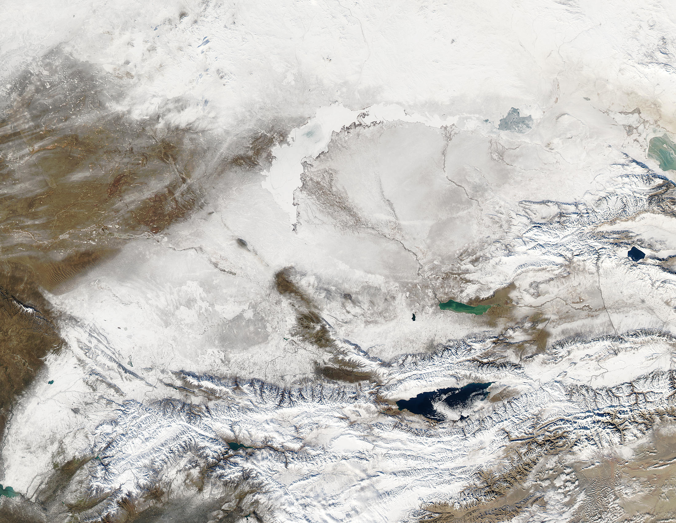 The top half of the image shows southeastern Kazakhstan. The country’s largest lake, Balqash KÃ curves across the top center of the image. Unlike Ysyk KÃ Blaqash KÃ is frozen. The smooth white of the lake’s icy surface blends with the snowy white of the surrounding landscape.