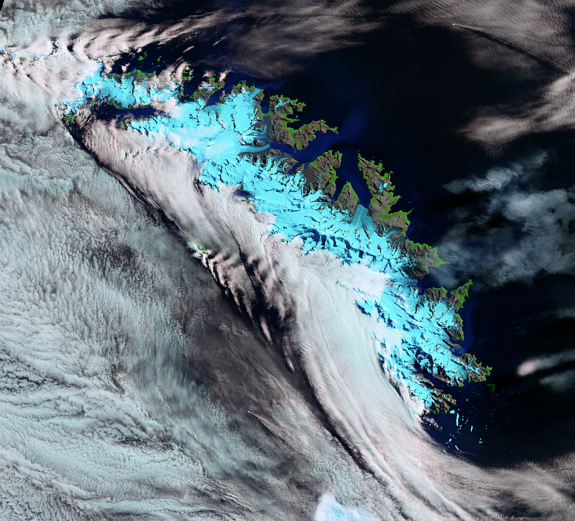 The island is home to a number of glaciers, some of which we can see along the jagged coast. The largest is Fortuna Glacier visible on the upper-central portion of the image.