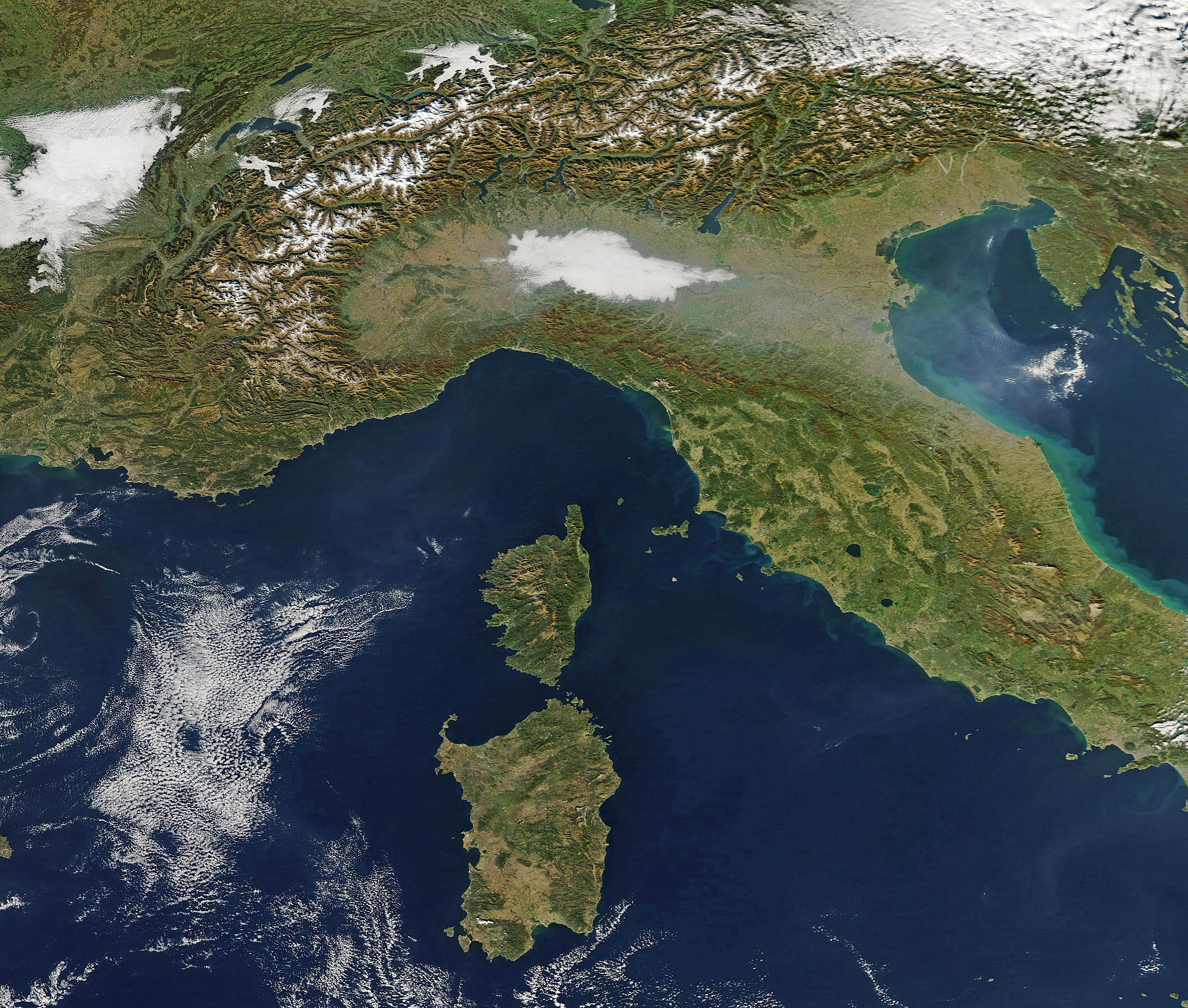 The image focuses on Northern Italy and the Mediterranean Sea. Two large, green islands sit in the blue waters of the Mediterranean Sea. Although neighboring, the islands belong to two different countries. The largest island is Sardegna (Sardinia), Italy, while the smaller is Corsica, France.