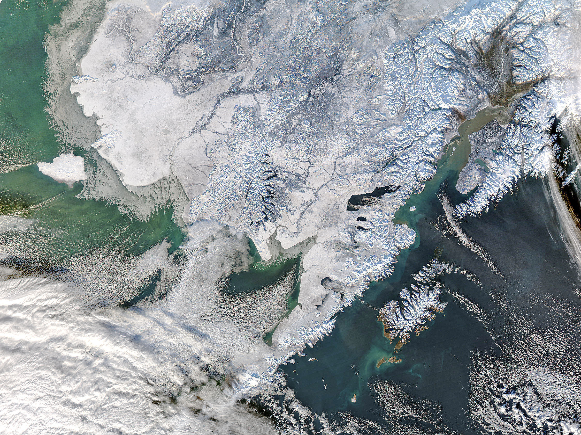 Snow and ice covered the land from the coast of the Gulf of Alaska, in the east, to the Bering Sea (west). Thin sheets of sea ice had begun to form along most of the coastline and were particularly noticeable along the Kuskokwim Delta, in the west. In contrast, brown sediment fills the waters of the Cook Inlet. The greenish coloration of the offshore waters gives evidence of blooms of phytoplankton – small plant-like organisms which live in the waters year-round, but reproduce explosively when conditions are favorable.