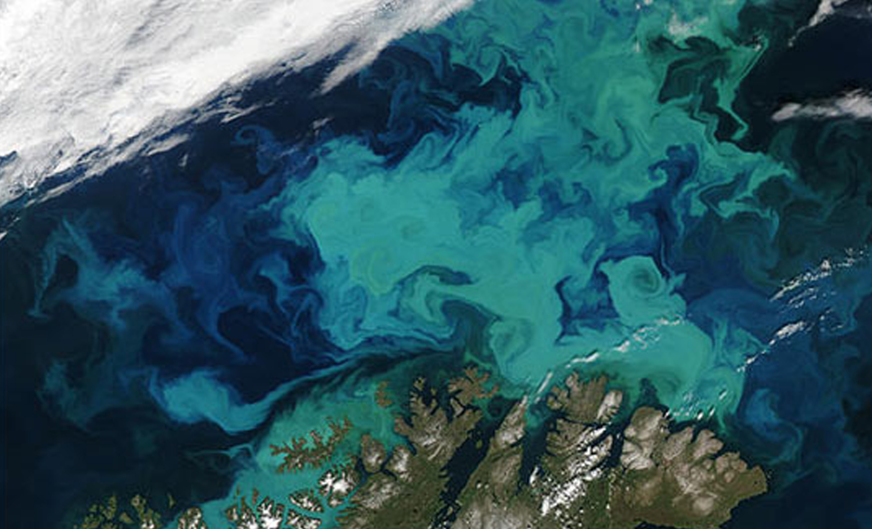 The Barents Sea north of Norway was awash in colorful swirls of blue and green on July 19, 2003. This spectacular display of color reveals the biological richness of these cold, nutrient-rich waters—a bloom of tiny marine plants called phytoplankton. The colors can be produced by a variety of pigments, including chlorophyll, that the plants use to harness sunlight for photosynthesis. The brightest blue color is sometimes the result of a kind of phytoplankton called a coccolithophore that has a calcium carbonate (chalk) covering. This chalky covering is bright white, and mixes with the blue reflection off the water to produce brilliant hues.