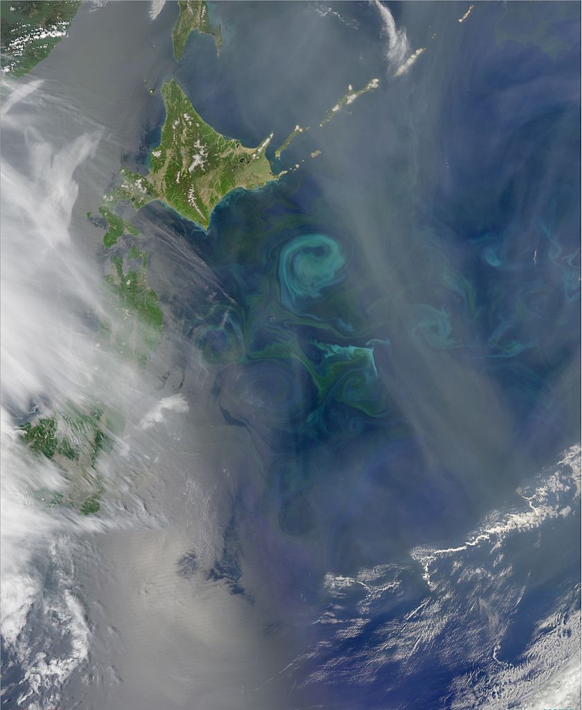 When two currents with different temperatures and densities (cold, Arctic water is saltier and denser than subtropical waters) collide, they create eddies. Phytoplankton growing in the surface waters become concentrated along the boundaries of these eddies, tracing out the motions of the water. The swirls of color visible in the waters southeast of Hokkaido (upper left), show where different kinds of phytoplankton are using chlorophyll and other pigments to capture sunlight and produce food. The bright blues just offshore of Hokkaido may be churned up sediment, rather than phytoplankton.