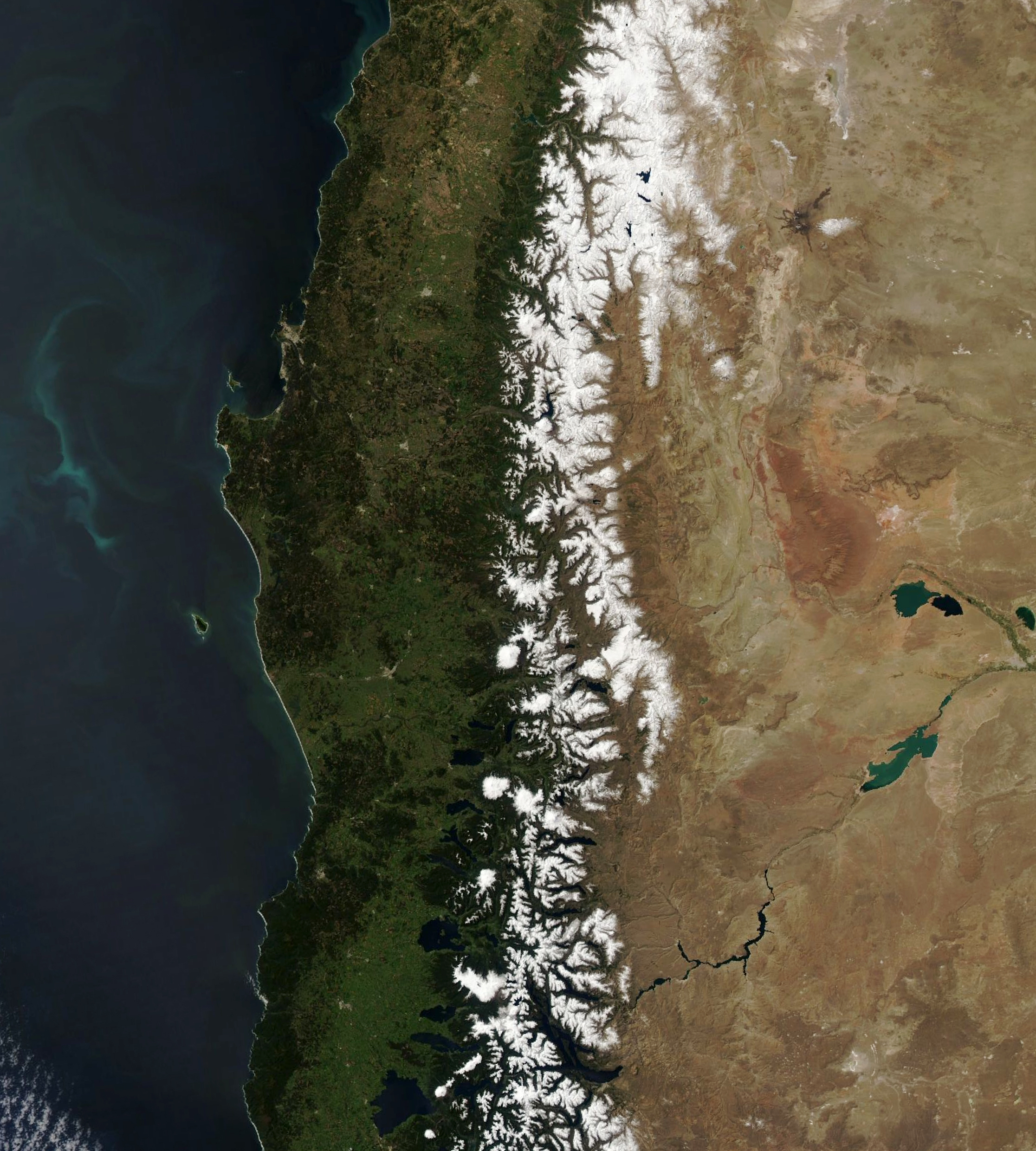 The Andes stretch out across seven countries along the western coast of South America. This photograph shows about 400 miles of the mountain range in Chile and Argentina.